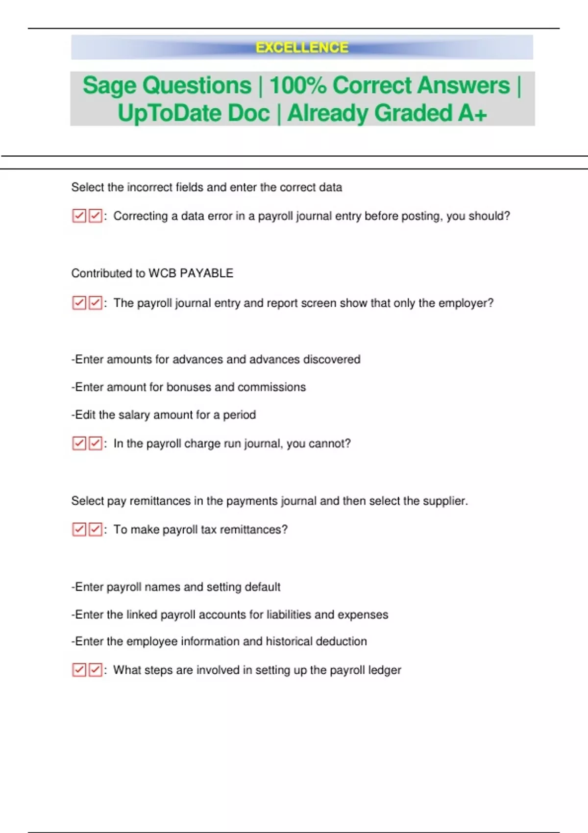 Select the incorrect fields and enter the correct data ☑: Correcting a data error in a payroll journal entry before posting, you should? Contributed to WCB PAYABLE ☑: The payroll journal entry and report screen show that only the employer? -Enter amounts for advances and advances discovered -Enter amount for bonuses and commissions -Edit the salary amount for a period ☑: In the payroll charge run journal, you cannot? Select pay remittances in the payments journal and then select the supplier. ☑: To make payroll tax remittances? -Enter payroll names and setting default -Enter the linked payroll accounts for liabilities and expenses -Enter the employee information and historical deduction ☑: What steps are involved in setting up the payroll ledger