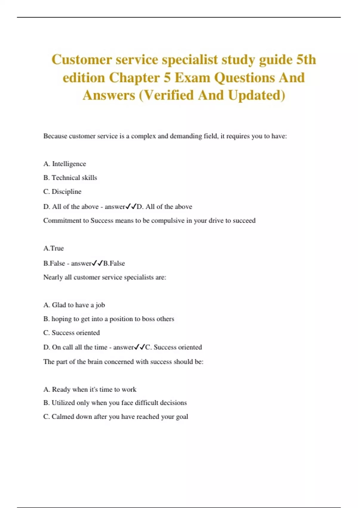 Customer service specialist study guide 5th edition Chapter 5 Exam Questions And Answers (Verified And Updated) Because customer service is a complex and demanding field, it requires you to have: A. Intelligence B. Technical skills C. Discipline D. All of the above - answerD. All of the above Commitment to Success means to be compulsive in your drive to succeed A.True B.False - answerB.False Nearly all customer service specialists are: A. Glad to have a job B. hoping to get into a position to boss others C. Success oriented D. On call all the time - answerC. Success oriented The part of the brain concerned with success should be: A. Ready when it's time to work B. Utilized only when you face difficult decisions C. Calmed down after you have reached your goal