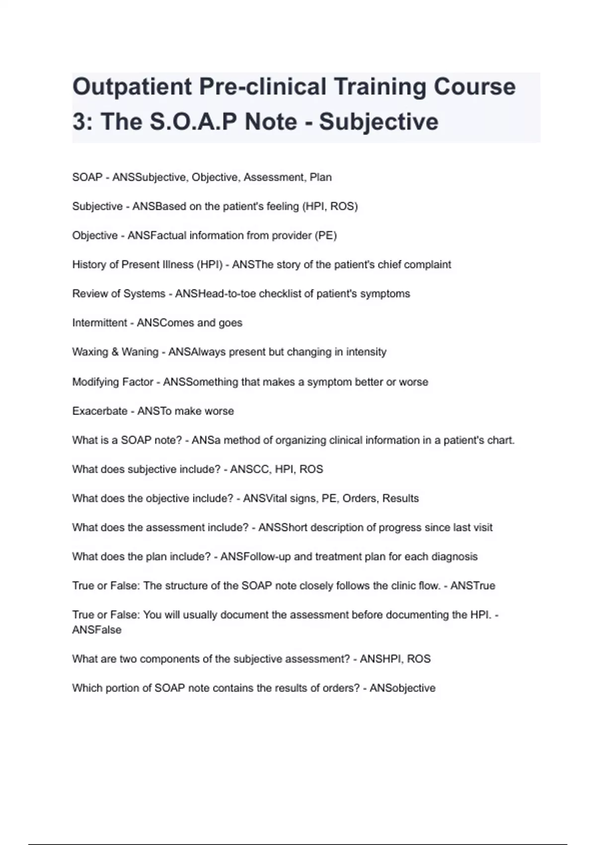 Outpatient Pre-clinical Training Course 3: The S.O.A.P Note - Subjective questions and answers A+ score assured 2024/2025