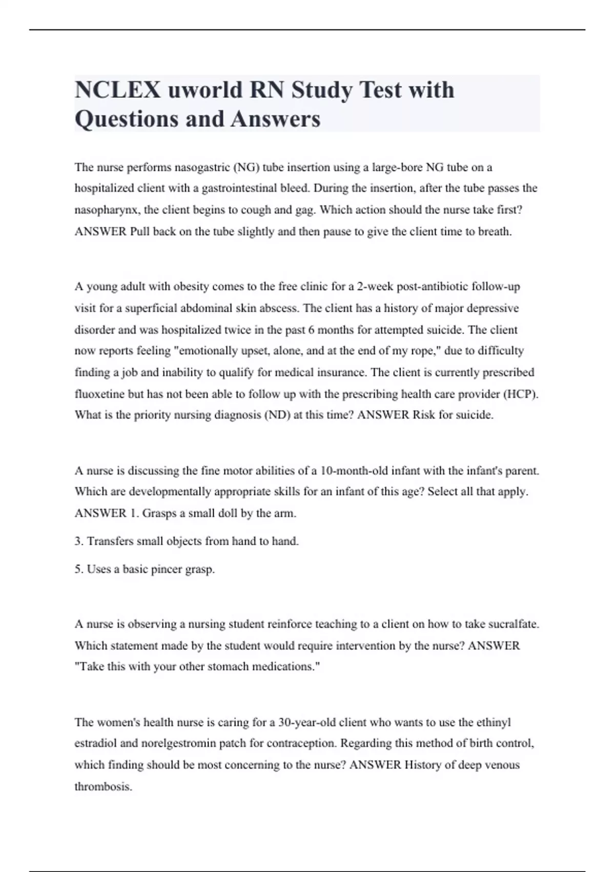 NCLEX uworld RN Study Test with Questions and Answers The nurse performs nasogastric (NG) tube insertion using a large-bore NG tube on a hospitalized client with a gastrointestinal bleed. During the insertion, after the tube passes the nasopharynx, the client begins to cough and gag. Which action should the nurse take first? ANSWER Pull back on the tube slightly and then pause to give the client time to breath. A young adult with obesity comes to the free clinic for a 2-week post-antibiotic follow-up visit for a superficial abdominal skin abscess. The client has a history of major depressive disorder and was hospitalized twice in the past 6 months for attempted suicide. The client now reports feeling "emotionally upset, alone, and at the end of my rope," due to difficulty finding a job and inability to qualify for medical insurance. The client is currently prescribed fluoxetine but has not been able to follow up with the prescribing health care provider (HCP). What is the priority nursing diagnosis (ND) at this time? ANSWER Risk for suicide. A nurse is discussing the fine motor abilities of a 10-month-old infant with the infant's parent. Which are developmentally appropriate skills for an infant of this age? Select all that apply. ANSWER 1. Grasps a small doll by the arm. 3. Transfers small objects from hand to hand. 5. Uses a basic pincer grasp. A nurse is observing a nursing student reinforce teaching to a client on how to take sucralfate. Which statement made by the student would require intervention by the nurse? ANSWER "Take this with your other stomach medications." The women's health nurse is caring for a 30-year-old client who wants to use the ethinyl estradiol and norelgestromin patch for contraception. Regarding this method of birth control, which finding should be most concerning to the nurse? ANSWER History of deep venous thrombosis.