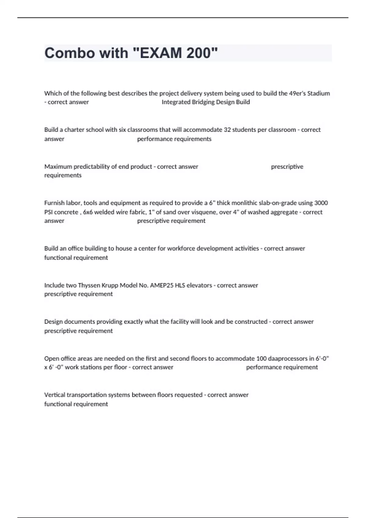 Which of the following best describes the project delivery system being used to build the 49er's Stadium - correct answer Integrated Bridging Design Build Build a charter school with six classrooms that will accommodate 32 students per classroom - correct answer performance requirements Maximum predictability of end product - correct answer prescriptive requirements Furnish labor, tools and equipment as required to provide a 6" thick monlithic slab-on-grade using 3000 PSI concrete , 6x6 welded wire fabric, 1" of sand over visquene, over 4" of washed aggregate - correct answer prescriptive requirement Build an office building to house a center for workforce development activities - correct answer functional requirement Include two Thyssen Krupp Model No. AMEP25 HLS elevators - correct answer prescriptive requirement Design documents providing exactly what the facility will look and be constructed - correct answer prescriptive requirement Open office areas are needed on the first and second floors to accommodate 100 daaprocessors in 6'-0" x 6' -0" work stations per floor - correct answer performance requirement Vertical transportation systems between floors requested - correct answer functional requirement Provide vertical transportation to accommodate the moving of 500 tenants daily - correct answer performance requirement Selection process in which qualitative proposals are submitted separately from the price proposals - correct answer Two envelope proposal Owner and D-B firm negotiates a contract based on subjective and qualitative factors - correct answer Qualifications based selection Awarded to the proposer with the highest combined total points of technical and price proposals - correct answer Weighted Criteria Selection in which qualitative aspects are scored on a 0 to 100 scale and expressed as decimal then bid price is then divided by the qualitative score to yield an "adjusted" low bid - correct answer Adjusted Low Bid Any selection process in which the proposal contains both price and qualitative components, and award is based upon a combination of price and qualitative considerations - correct answer Best Value selection Should be established and in place before deciding to pursue a project - correct answer Teaming agreement The single most important distinction about design-build - correct answer Team Approach Finding the holes between the design and use processes and filling them - correct answer Gap Management Thinking through and seeking solutions regardless of your training providing multiple perspectives to solving problems - correct answer Interdisciplinary Fluency Multi-disciplined, collaborative approach to the way a project team relates. - correct answer Integrated services Cost and performance are fixed - correct answer Design Build Design dictates cost and performance is a variable - correct answer Design Bid Build Constructor establishes design parameters for architect - correct answer Design Build Owner is not liable for any "gaps" between the plans and specs and the requirements for performance - correct answer Design Build Owner warrants the sufficiency of the plans and specs to the contractor - correct answer Design Bid Build (T/F) In DB the Owner controls the details of the design - correct answer False (T/F) According to DBIA, lack of communication is the number one reason why teams fail - correct answer False The _______ is responsible for choosing a selection panel who help decide which proposer wins the award of a project. - correct answer Owner Under DB project delivery, the _______ owns the "details" of the design. - correct answer Design-Build Entity (T/F) When using a "Best Value Criteria Matrix," the proposer/design-build entity with the lowest price proposal in their bid wins the award. - correct answer False (T/F) An essential concept of DB is the there are multiple points of responsibility - correct answer True (T/F) The Master Format (CSI) is the estimating format used primarily for detailed estimating - correct answer True In determining the Selection panel, the ideal size for most projects is ________ people - correct answer 4-6 (T/F) Under DB the DB'er warranties all plans and specifications used for the project including bridging documents - correct answer False