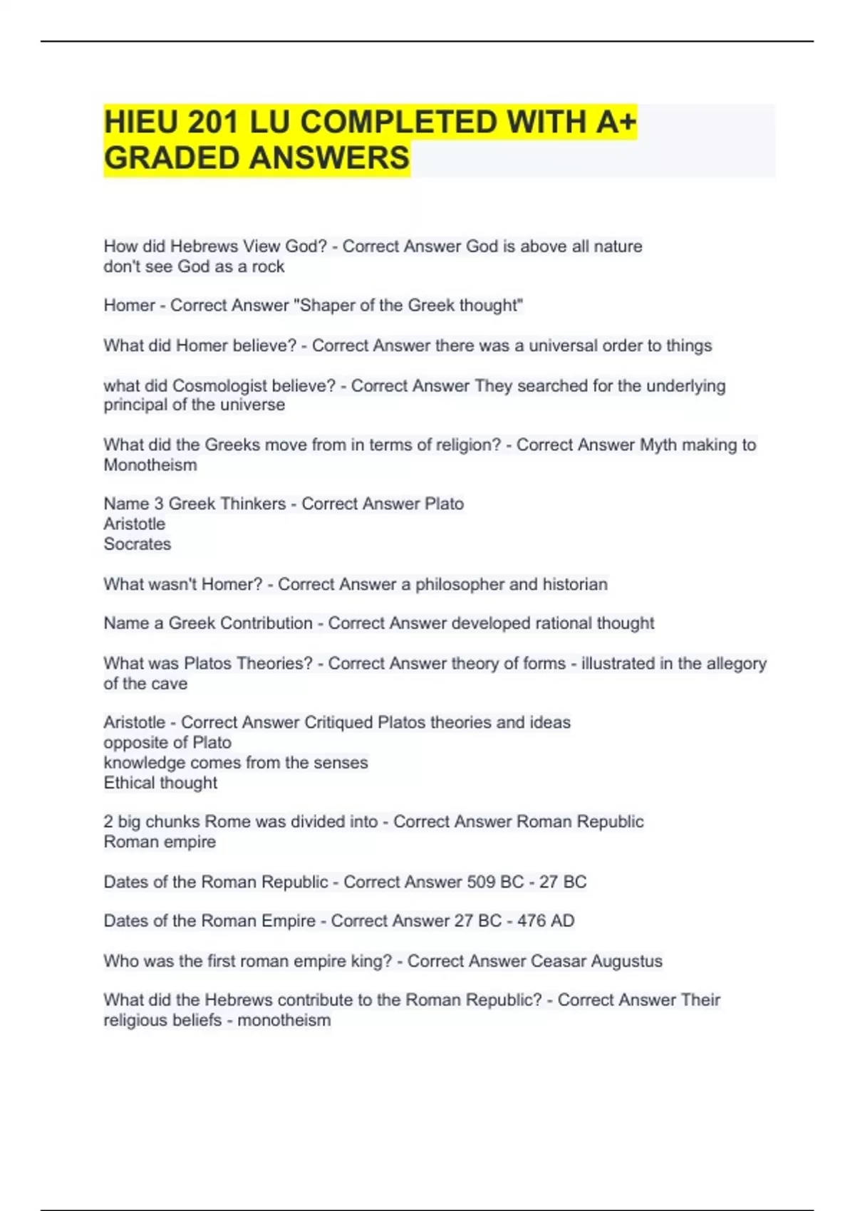 How did Hebrews View God? - Correct Answer God is above all nature don't see God as a rock Homer - Correct Answer "Shaper of the Greek thought" What did Homer believe? - Correct Answer there was a universal order to things what did Cosmologist believe? - Correct Answer They searched for the underlying principal of the universe What did the Greeks move from in terms of religion? - Correct Answer Myth making to Monotheism Name 3 Greek Thinkers - Correct Answer Plato Aristotle Socrates What wasn't Homer? - Correct Answer a philosopher and historian Name a Greek Contribution - Correct Answer developed rational thought What was Platos Theories? - Correct Answer theory of forms - illustrated in the allegory of the cave Aristotle - Correct Answer Critiqued Platos theories and ideas opposite of Plato knowledge comes from the senses Ethical thought 2 big chunks Rome was divided into - Correct Answer Roman Republic Roman empire Dates of the Roman Republic - Correct Answer 509 BC - 27 BC Dates of the Roman Empire - Correct Answer 27 BC - 476 AD Who was the first roman empire king? - Correct Answer Ceasar Augustus What did the Hebrews contribute to the Roman Republic? - Correct Answer Their religious beliefs - monotheism