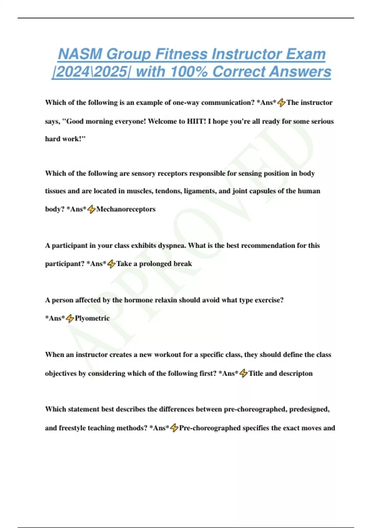 NASM Group Fitness Instructor Exam || with 100% Correct Answers Which of the following is an example of one-way communication? *Ans* The instructor says, "Good morning everyone! Welcome to HIIT! I hope you're all ready for some serious hard work!" Which of the following are sensory receptors responsible for sensing position in body tissues and are located in muscles, tendons, ligaments, and joint capsules of the human body? *Ans* Mechanoreceptors A participant in your class exhibits dyspnea. What is the best recommendation for this participant? *Ans* Take a prolonged break A person affected by the hormone relaxin should avoid what type exercise? *Ans* Plyometric When an instructor creates a new workout for a specific class, they should define the class objectives by considering which of the following first? *Ans* Title and descripton Which statement best describes the differences between pre-choreographed, predesigned, and freestyle teaching methods? *Ans* Pre-choreographed specifies the exact moves and music to be used; predesigned provides direction and a class template; freestyle is based on the instructor's personal preferences. One of the most consistent findings with regard to exercise behavior is the positive relationship between self-confidence and which of the following? *Ans* Adherence Which of the following is a function of a heart valve? *Ans* It prevents backflow or spillage of blood back into the chambers. How many components of class design does AFAA recommend? *Ans* 5 Which of the following is the primary purpose for starting older adults with light loads and low volume? *Ans* To optimize movement What is biomechanics the study of? *Ans* How forces affect a living body Which teaching method consists of designing, developing, and delivering movement to group fitness participants based on the Group Fitness Instructor's own personal preferences, skill set, and knowled