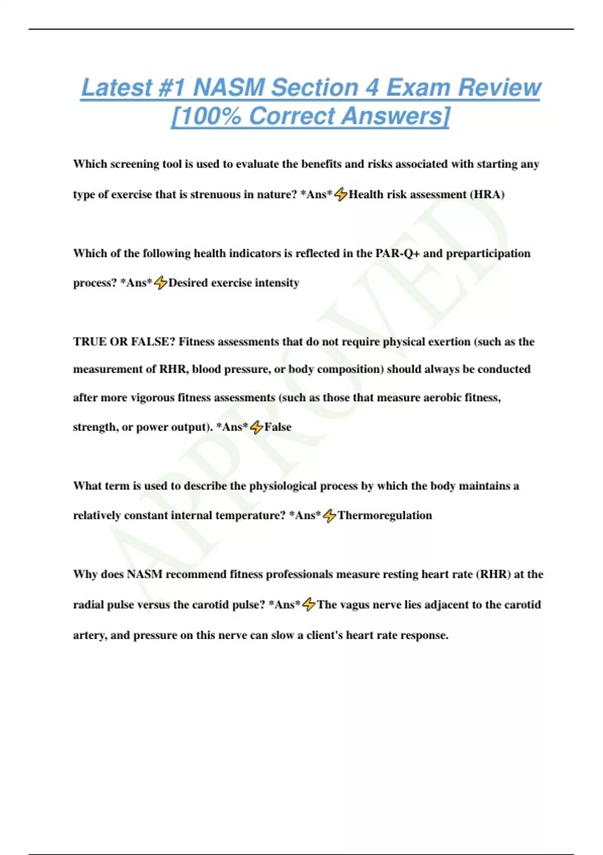 Latest #1 NASM Section 4 Exam Review [100% Correct Answers] Which screening tool is used to evaluate the benefits and risks associated with starting any type of exercise that is strenuous in nature? *Ans* Health risk assessment (HRA) Which of the following health indicators is reflected in the PAR-Q+ and preparticipation process? *Ans* Desired exercise intensity TRUE OR FALSE? Fitness assessments that do not require physical exertion (such as the measurement of RHR, blood pressure, or body composition) should always be conducted after more vigorous fitness assessments (such as those that measure aerobic fitness, strength, or power output). *Ans* False What term is used to describe the physiological process by which the body maintains a relatively constant internal temperature? *Ans* Thermoregulation Why does NASM recommend fitness professionals measure resting heart rate (RHR) at the radial pulse versus the carotid pulse? *Ans* The vagus nerve lies adjacent to the carotid artery, and pressure on this nerve can slow a client's heart rate response. Which principle assumes that the volume of fluid displaced by an object is equivalent to the volume of the object fully immersed in that fluid or to the specific fraction of the volume below the surface? *Ans* Archimedes' principle What is the most valid measurement of aerobic fitness? *Ans* VO2max Which of the following is the part of the cell that uses nutrients to create energy for the cell? *Ans* Mitochondrion How many skinfold sites are measured when determining body composition using the Durnin-Womersley protocol? *Ans* 4 Which of the following is not a component that needs to be considered when planning a VT1 test? *Ans* Environmental temperature Which of the following statements defines the chest skinfold location for men? *Ans* A diagonal fold taken half the distance between the anterior axillary line and the nipple For which population is the 1.5-mile (2.4-km) run test considered most valid