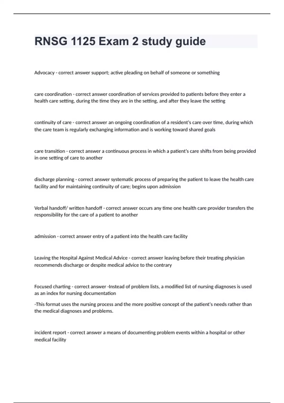 RNSG 1125 Exam 2 study guideAdvocacy - correct answer support; active pleading on behalf of someone or something care coordination - correct answer coordination of services provided to patients before they enter a health care setting, during the time they are in the setting, and after they leave the setting continuity of care - correct answer an ongoing coordination of a resident's care over time, during which the care team is regularly exchanging information and is working toward shared goals care transition - correct answer a continuous process in which a patient's care shifts from being provided in one setting of care to another discharge planning - correct answer systematic process of preparing the patient to leave the health care facility and for maintaining continuity of care; begins upon admission Verbal handoff/ written handoff - correct answer occurs any time one health care provider transfers the responsibility for the care of a patient to another admission - correct answer entry of a patient into the health care facility Leaving the Hospital Against Medical Advice - correct answer leaving before their treating physician recommends discharge or despite medical advice to the contrary Focused charting - correct answer -Instead of problem lists, a modified list of nursing diagnoses is used as an index for nursing documentation -This format uses the nursing process and the more positive concept of the patient's needs rather than the medical diagnoses and problems. incident report - correct answer a means of documenting problem events within a hospital or other medical facility