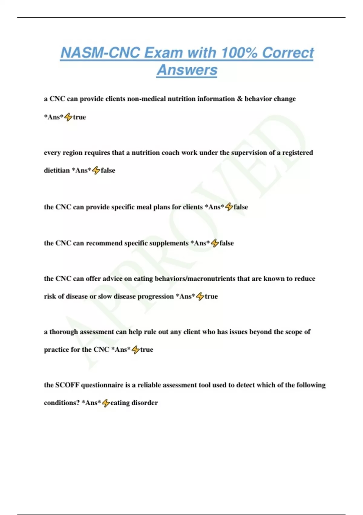 NASM-CNC Exam with 100% Correct Answers a CNC can provide clients non-medical nutrition information & behavior change *Ans* true every region requires that a nutrition coach work under the supervision of a registered dietitian *Ans* false the CNC can provide specific meal plans for clients *Ans* false the CNC can recommend specific supplements *Ans* false the CNC can offer advice on eating behaviors/macronutrients that are known to reduce risk of disease or slow disease progression *Ans* true a thorough assessment can help rule out any client who has issues beyond the scope of practice for the CNC *Ans* true the SCOFF questionnaire is a reliable assessment tool used to detect which of the following conditions? *Ans* eating disorder an unexplained surge in athletic performance is a reason for the CNC to refer their client to a registered dietitian *Ans* false a client who confides of suicidal thoughts should be referred to a psychologist *Ans* true it is appropriate for the CNC to recommend an over the counter antacid when a client complains about recent episodes of heart burn *Ans* false when it comes to client confidentiality, all personal information should be kept in a locked/secure area *Ans* true if the CNC intends to work as an employee in a private health club, its important to consult with an attorney & accountant to ensure proper business practices *Ans* true when working with a client who has been complaining of low back pain that has been getting worse, what is the most appropriate recommendation *Ans* refer to a chiropractor common assessments performed by a CNC include height, weight, body composition & what other test? *Ans* anthropometric meas