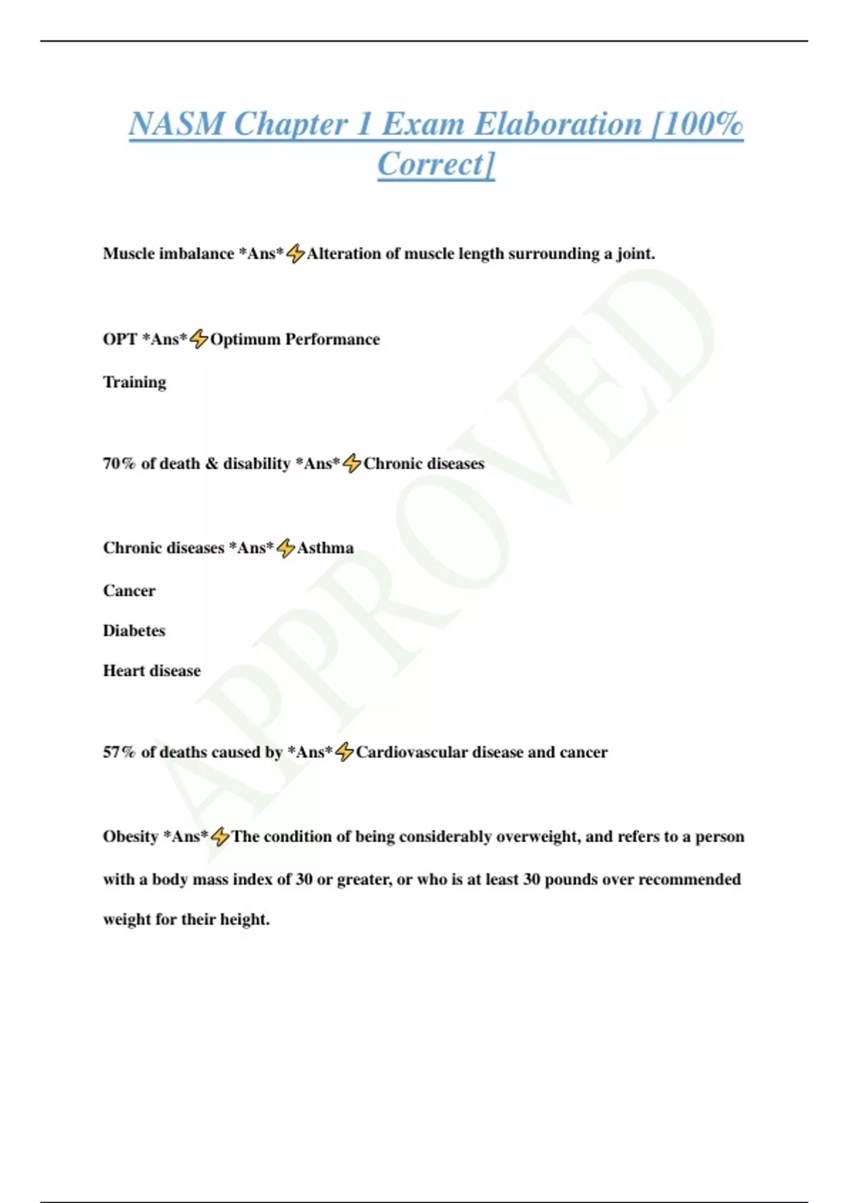NASM Chapter 1 Exam Elaboration [100% Correct] Muscle imbalance *Ans* Alteration of muscle length surrounding a joint. OPT *Ans* Optimum Performance Training 70% of death & disability *Ans* Chronic diseases Chronic diseases *Ans* Asthma Cancer Diabetes Heart disease 57% of deaths caused by *Ans* Cardiovascular disease and cancer Obesity *Ans* The condition of being considerably overweight, and refers to a person with a body mass index of 30 or greater, or who is at least 30 pounds over recommended weight for their height. Overweight *Ans* Refers to a person with a body mass index of 25 to 29.9,or who is between 25 to 30 pounds over the recommended weight for their height. Desirable BMI for adult 20 years and older *Ans* Between 18.5 and 24.9 Americans older then age 20 overweight *Ans* 66% Americans that are obese *Ans* 34% Experts predict how many kids will be overweight by 2015 *Ans* One in four kids BMI *Ans* Body mass index BMI calculation formula *Ans* BMI = 703 x weight(lb)/height (in) BMI is *Ans* A persons weight in pounds divided by height Blood lipids *Ans* Also known as cholesterol and triglycerides, blood lipids are carried by protein molecules known as high-density lipoproteins (HD