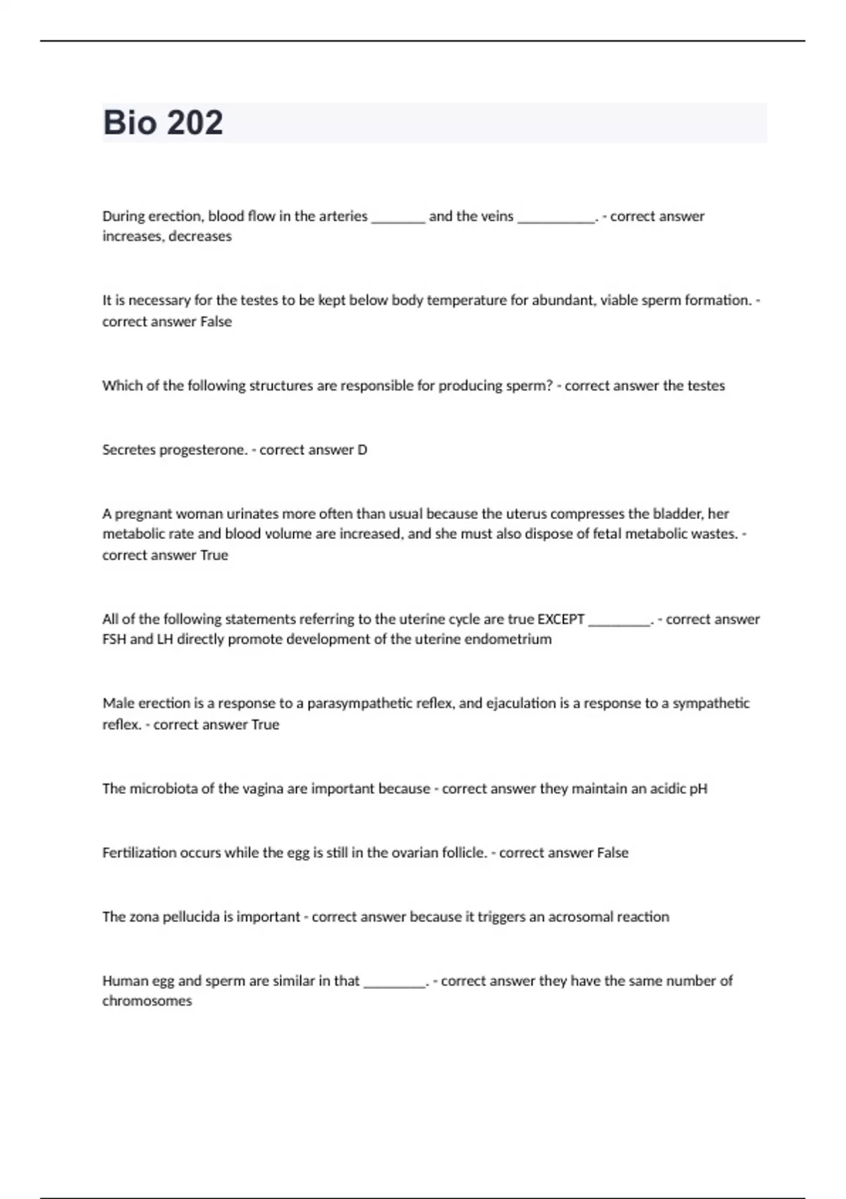 BIO 202 Arizona State University -Bio 202 questions well answeredDuring erection, blood flow in the arteries _______ and the veins __________. - correct answer increases, decreases It is necessary for the testes to be kept below body temperature for abundant, viable sperm formation. - correct answer False Which of the following structures are responsible for producing sperm? - correct answer the testes Secretes progesterone. - correct answer D A pregnant woman urinates more often than usual because the uterus compresses the bladder, her metabolic rate and blood volume are increased, and she must also dispose of fetal metabolic wastes. - correct answer True All of the following statements referring to the uterine cycle are true EXCEPT ________. - correct answer FSH and LH directly promote development of the uterine endometrium Male erection is a response to a parasympathetic reflex, and ejaculation is a response to a sympathetic reflex. - correct answer True The microbiota of the vagina are important because - correct answer they maintain an acidic pH Fertilization occurs while the egg is still in the ovarian follicle. - correct answer False The zona pellucida is important - correct answer because it triggers an acrosomal reaction Human egg and sperm are similar in that ________. - correct answer they have the same number of chromosomes
