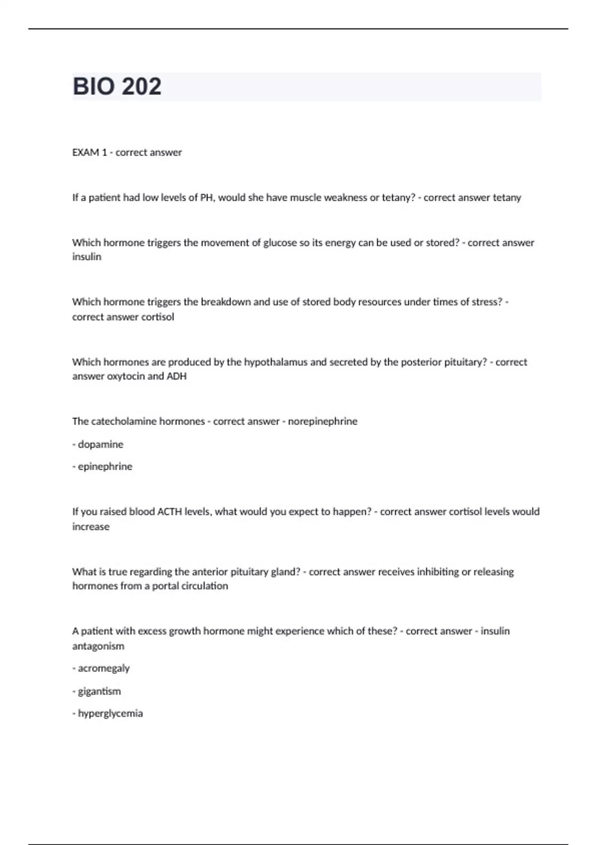 BIO 202 Arizona State University -BIO 202 already passedEXAM 1 - correct answer If a patient had low levels of PH, would she have muscle weakness or tetany? - correct answer tetany Which hormone triggers the movement of glucose so its energy can be used or stored? - correct answer insulin Which hormone triggers the breakdown and use of stored body resources under times of stress? - correct answer cortisol Which hormones are produced by the hypothalamus and secreted by the posterior pituitary? - correct answer oxytocin and ADH The catecholamine hormones - correct answer - norepinephrine - dopamine - epinephrine If you raised blood ACTH levels, what would you expect to happen? - correct answer cortisol levels would increase What is true regarding the anterior pituitary gland? - correct answer receives inhibiting or releasing hormones from a portal circulation A patient with excess growth hormone might experience which of these? - correct answer - insulin antagonism - acromegaly - gigantism - hyperglycemia