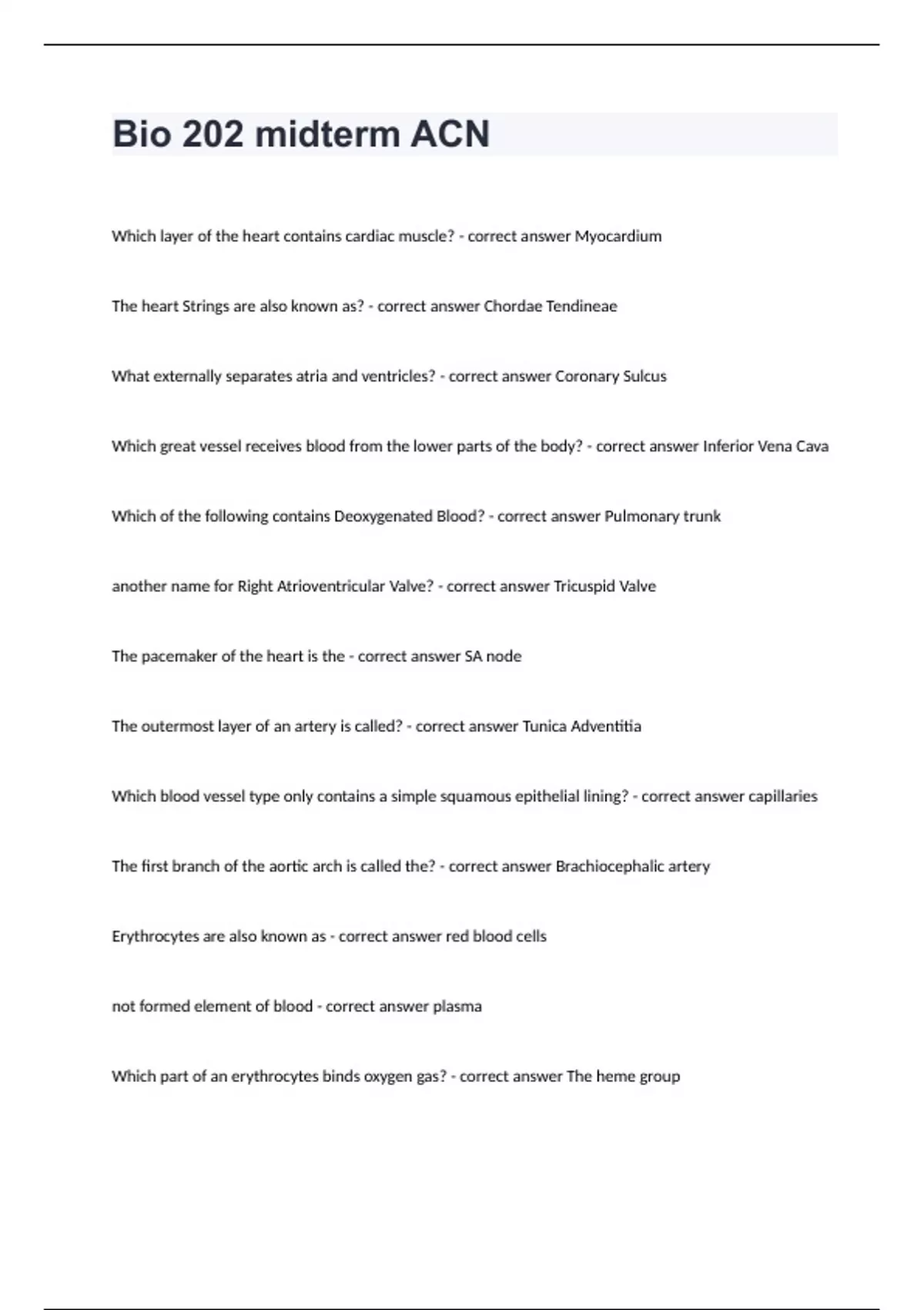 BIO 202 Arizona State University -Bio 202 midterm ACN well answeredWhich layer of the heart contains cardiac muscle? - correct answer Myocardium The heart Strings are also known as? - correct answer Chordae Tendineae What externally separates atria and ventricles? - correct answer Coronary Sulcus Which great vessel receives blood from the lower parts of the body? - correct answer Inferior Vena Cava Which of the following contains Deoxygenated Blood? - correct answer Pulmonary trunk another name for Right Atrioventricular Valve? - correct answer Tricuspid Valve The pacemaker of the heart is the - correct answer SA node The outermost layer of an artery is called? - correct answer Tunica Adventitia Which blood vessel type only contains a simple squamous epithelial lining? - correct answer capillaries The first branch of the aortic arch is called the? - correct answer Brachiocephalic artery Erythrocytes are also known as - correct answer red blood cells not formed element of blood - correct answer plasma Which part of an erythrocytes binds oxygen gas? - correct answer The heme group