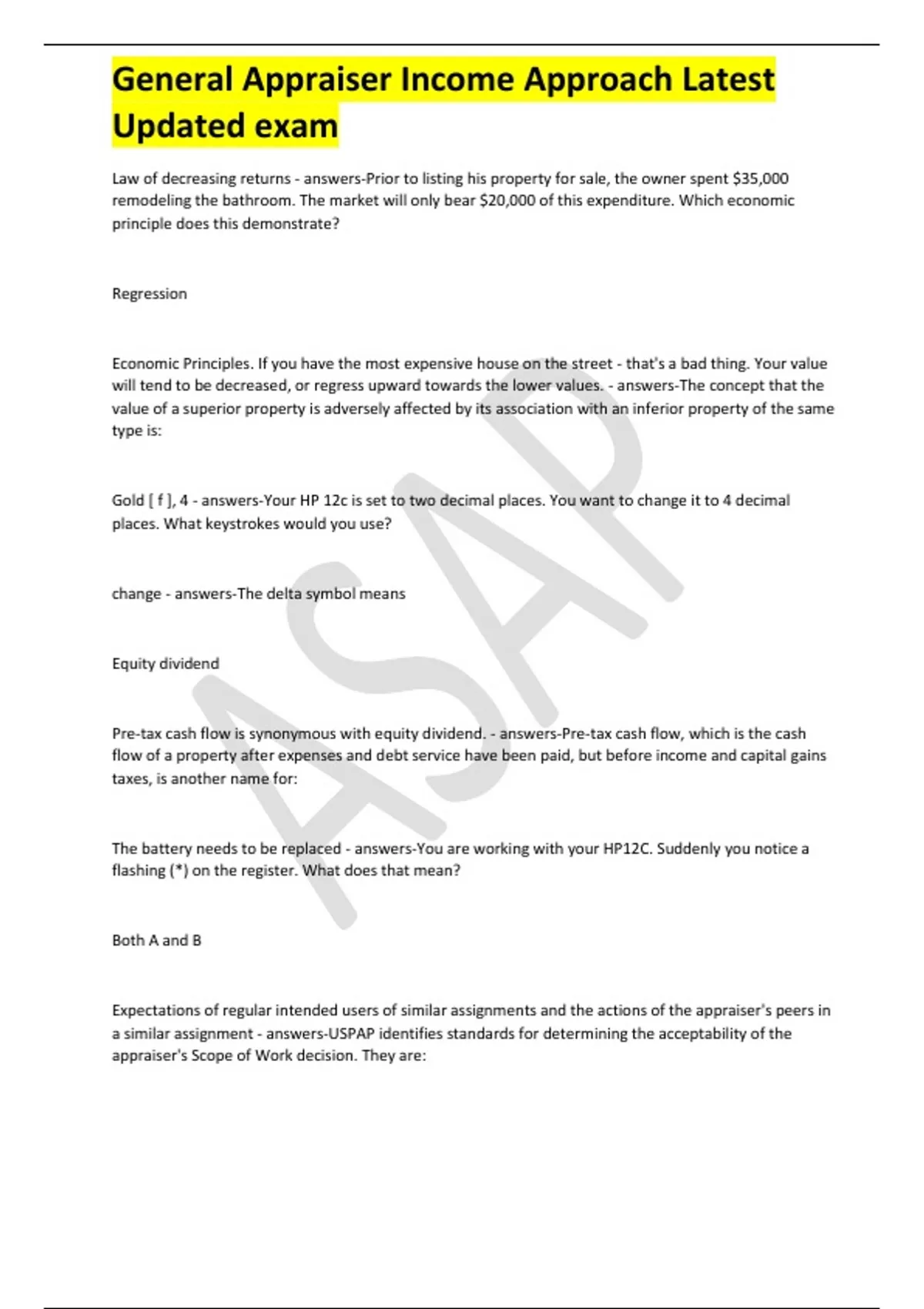 General Appraiser Income Approach Latest Updated exam Law of decreasing returns - answers-Prior to listing his property for sale, the owner spent $35,000 remodeling the bathroom. The market will only bear $20,000 of this expenditure. Which economic principle does this demonstrate? Regression Economic Principles. If you have the most expensive house on the street - that's a bad thing. Your value will tend to be decreased, or regress upward towards the lower values. - answers-The concept that the value of a superior property is adversely affected by its association with an inferior property of the same type is: