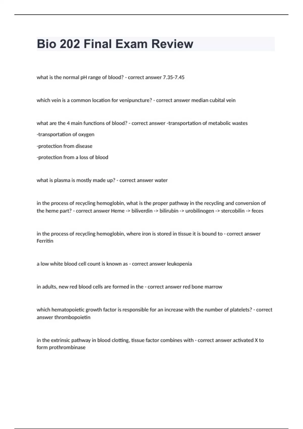 BIO 202 Arizona State University -Bio 202 Final Exam Review updated already passedwhat is the normal pH range of blood? - correct answer 7.35-7.45 which vein is a common location for venipuncture? - correct answer median cubital vein what are the 4 main functions of blood? - correct answer -transportation of metabolic wastes -transportation of oxygen -protection from disease -protection from a loss of blood what is plasma is mostly made up? - correct answer water in the process of recycling hemoglobin, what is the proper pathway in the recycling and conversion of the heme part? - correct answer Heme -> biliverdin -> bilirubin -> urobilinogen -> stercobilin -> feces in the process of recycling hemoglobin, where iron is stored in tissue it is bound to - correct answer Ferritin a low white blood cell count is known as - correct answer leukopenia in adults, new red blood cells are formed in the - correct answer red bone marrow which hematopoietic growth factor is responsible for an increase with the number of platelets? - correct answer thrombopoietin in the extrinsic pathway in blood clotting, tissue factor combines with - correct answer activated X to form prothrombinase