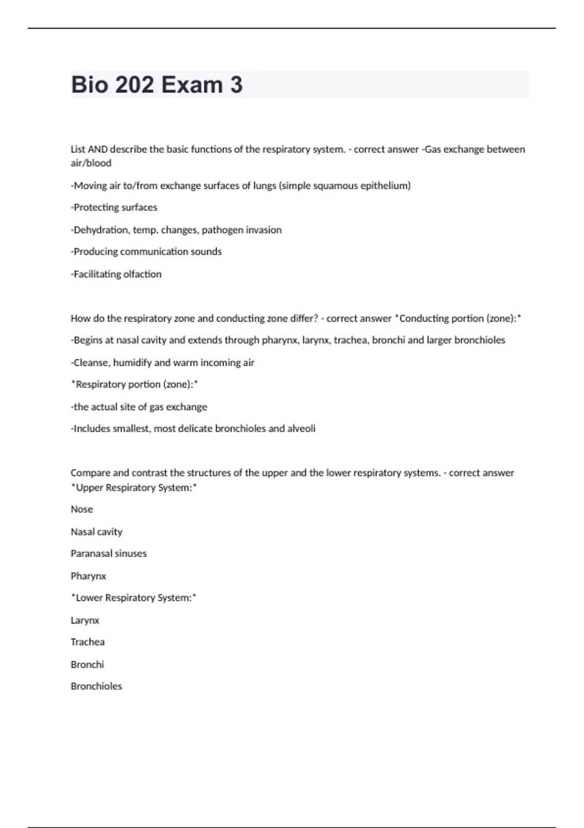 BIO 202 Arizona State University -Bio 202 Exam 3 questions n answersList AND describe the basic functions of the respiratory system. - correct answer -Gas exchange between air/blood -Moving air to/from exchange surfaces of lungs (simple squamous epithelium) -Protecting surfaces -Dehydration, temp. changes, pathogen invasion -Producing communication sounds -Facilitating olfaction How do the respiratory zone and conducting zone differ? - correct answer *Conducting portion (zone):* -Begins at nasal cavity and extends through pharynx, larynx, trachea, bronchi and larger bronchioles -Cleanse, humidify and warm incoming air *Respiratory portion (zone):* -the actual site of gas exchange -Includes smallest, most delicate bronchioles and alveoli Compare and contrast the structures of the upper and the lower respiratory systems. - correct answer *Upper Respiratory System:* Nose Nasal cavity Paranasal sinuses Pharynx *Lower Respiratory System:* Larynx Trachea Bronchi Bronchioles