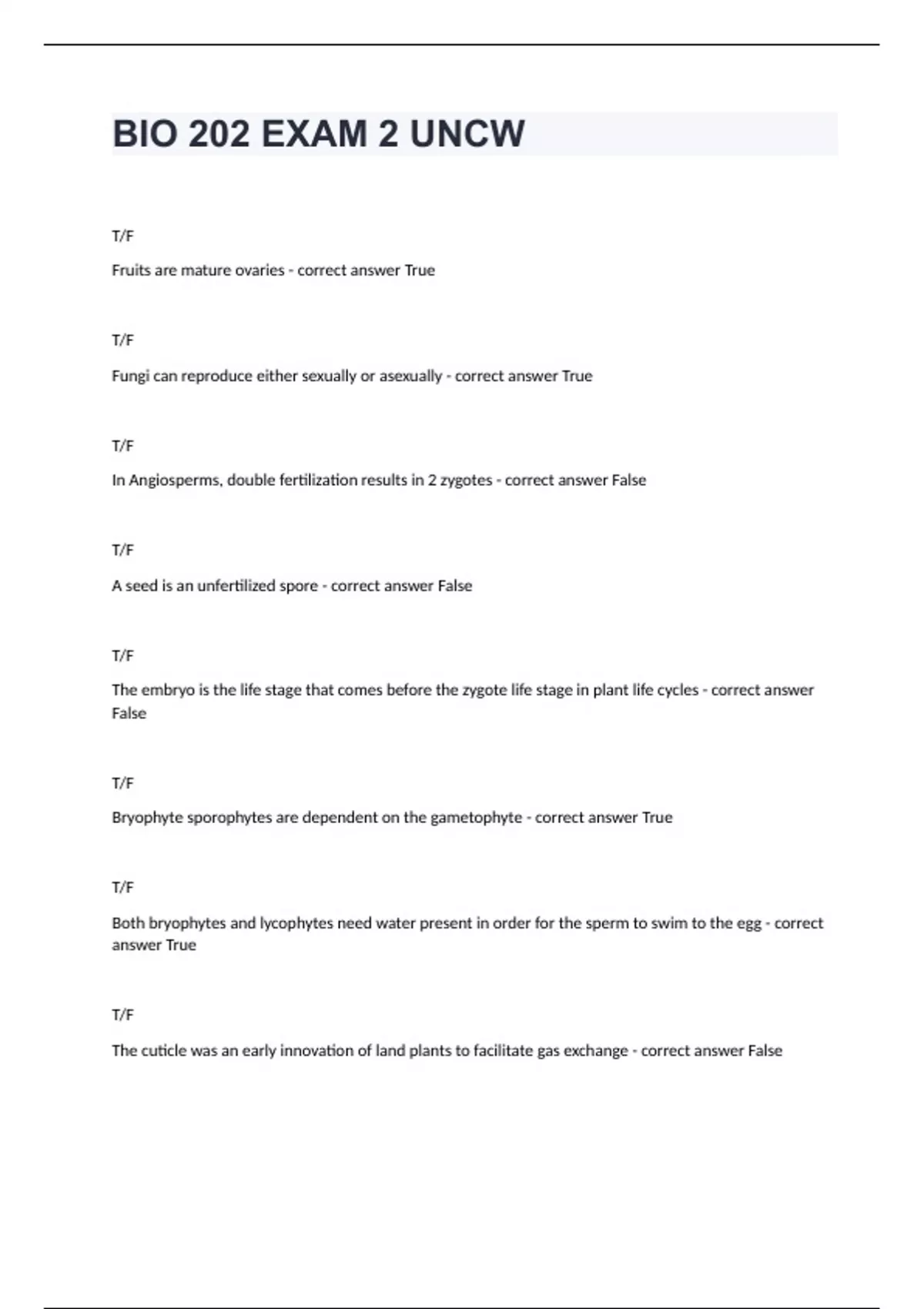 BIO 202 Arizona State University -BIO 202 EXAM 2 UNCW updated to passT/F Fruits are mature ovaries - correct answer True T/F Fungi can reproduce either sexually or asexually - correct answer True T/F In Angiosperms, double fertilization results in 2 zygotes - correct answer False T/F A seed is an unfertilized spore - correct answer False T/F The embryo is the life stage that comes before the zygote life stage in plant life cycles - correct answer False T/F Bryophyte sporophytes are dependent on the gametophyte - correct answer True T/F Both bryophytes and lycophytes need water present in order for the sperm to swim to the egg - correct answer True T/F The cuticle was an early innovation of land plants to facilitate gas exchange - correct answer False