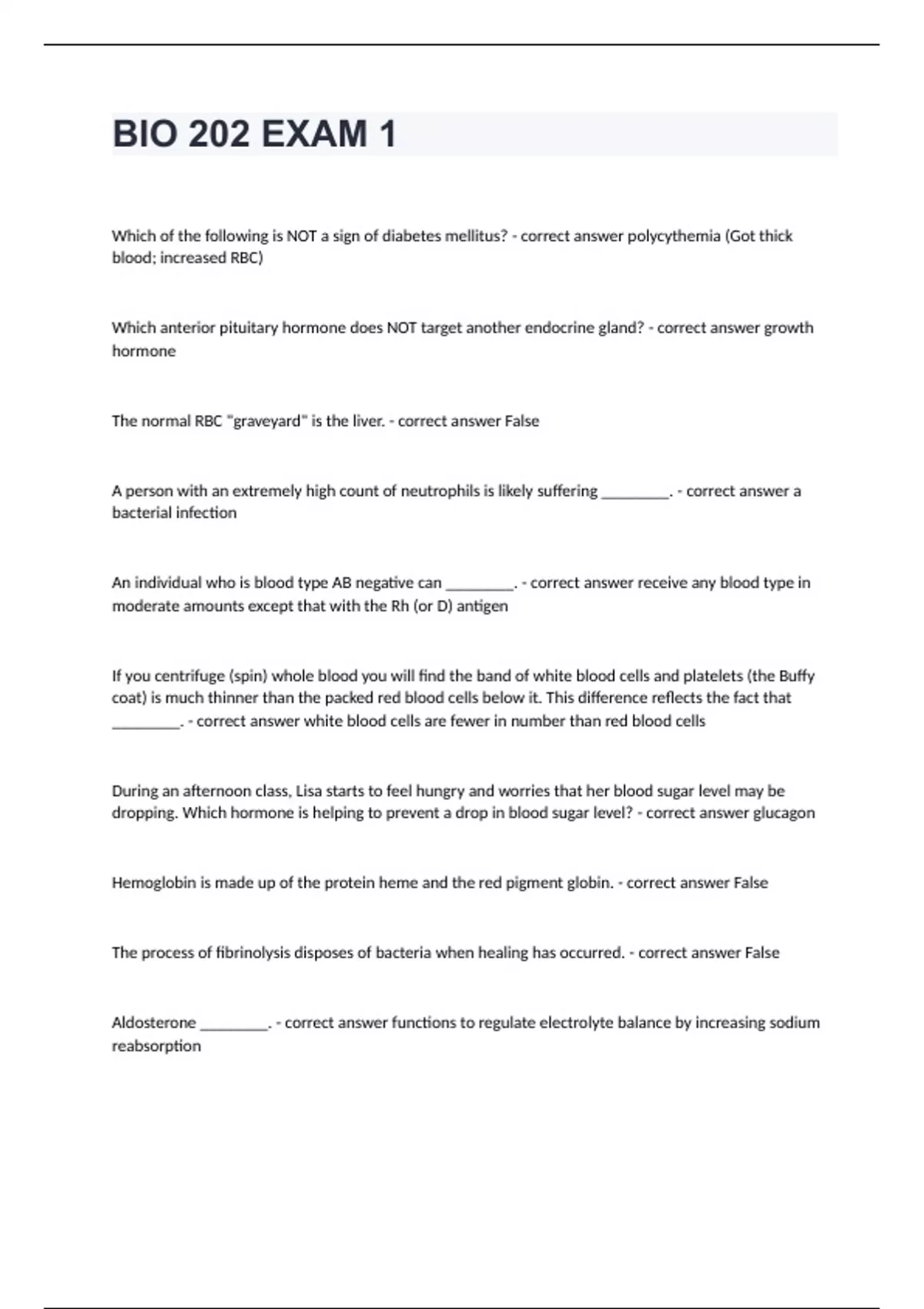 BIO 202 Arizona State University -BIO 202 EXAM 1 with verified answersWhich of the following is NOT a sign of diabetes mellitus? - correct answer polycythemia (Got thick blood; increased RBC) Which anterior pituitary hormone does NOT target another endocrine gland? - correct answer growth hormone The normal RBC "graveyard" is the liver. - correct answer False A person with an extremely high count of neutrophils is likely suffering ________. - correct answer a bacterial infection An individual who is blood type AB negative can ________. - correct answer receive any blood type in moderate amounts except that with the Rh (or D) antigen If you centrifuge (spin) whole blood you will find the band of white blood cells and platelets (the Buffy coat) is much thinner than the packed red blood cells below it. This difference reflects the fact that ________. - correct answer white blood cells are fewer in number than red blood cells During an afternoon class, Lisa starts to feel hungry and worries that her blood sugar level may be dropping. Which hormone is helping to prevent a drop in blood sugar level? - correct answer glucagon Hemoglobin is made up of the protein heme and the red pigment globin. - correct answer False The process of fibrinolysis disposes of bacteria when healing has occurred. - correct answer False Aldosterone ________. - correct answer functions to regulate electrolyte balance by increasing sodium reabsorption