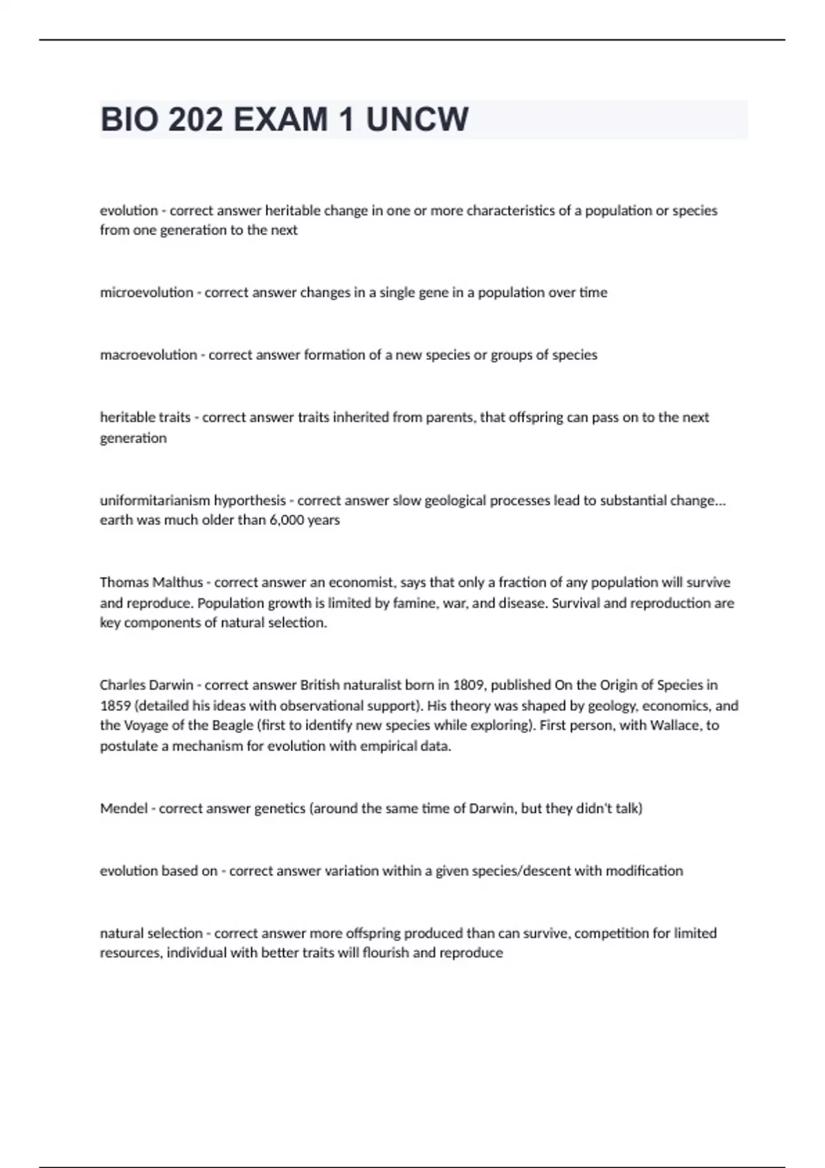 BIO 202 Arizona State University -BIO 202 EXAM 1 UNCW with complete solutionsevolution - correct answer heritable change in one or more characteristics of a population or species from one generation to the next microevolution - correct answer changes in a single gene in a population over time macroevolution - correct answer formation of a new species or groups of species heritable traits - correct answer traits inherited from parents, that offspring can pass on to the next generation uniformitarianism hyporthesis - correct answer slow geological processes lead to substantial change... earth was much older than 6,000 years Thomas Malthus - correct answer an economist, says that only a fraction of any population will survive and reproduce. Population growth is limited by famine, war, and disease. Survival and reproduction are key components of natural selection. Charles Darwin - correct answer British naturalist born in 1809, published On the Origin of Species in 1859 (detailed his ideas with observational support). His theory was shaped by geology, economics, and the Voyage of the Beagle (first to identify new species while exploring). First person, with Wallace, to postulate a mechanism for evolution with empirical data. Mendel - correct answer genetics (around the same time of Darwin, but they didn't talk) evolution based on - correct answer variation within a given species/descent with modification natural selection - correct answer more offspring produced than can survive, competition for limited resources, individual with better traits will flourish and reproduce