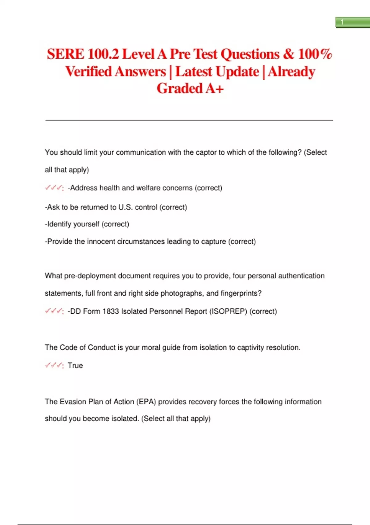 SERE 100.2 Level A Pre Test Questions & 100% Verified Answers | Latest Update | Already Graded A+