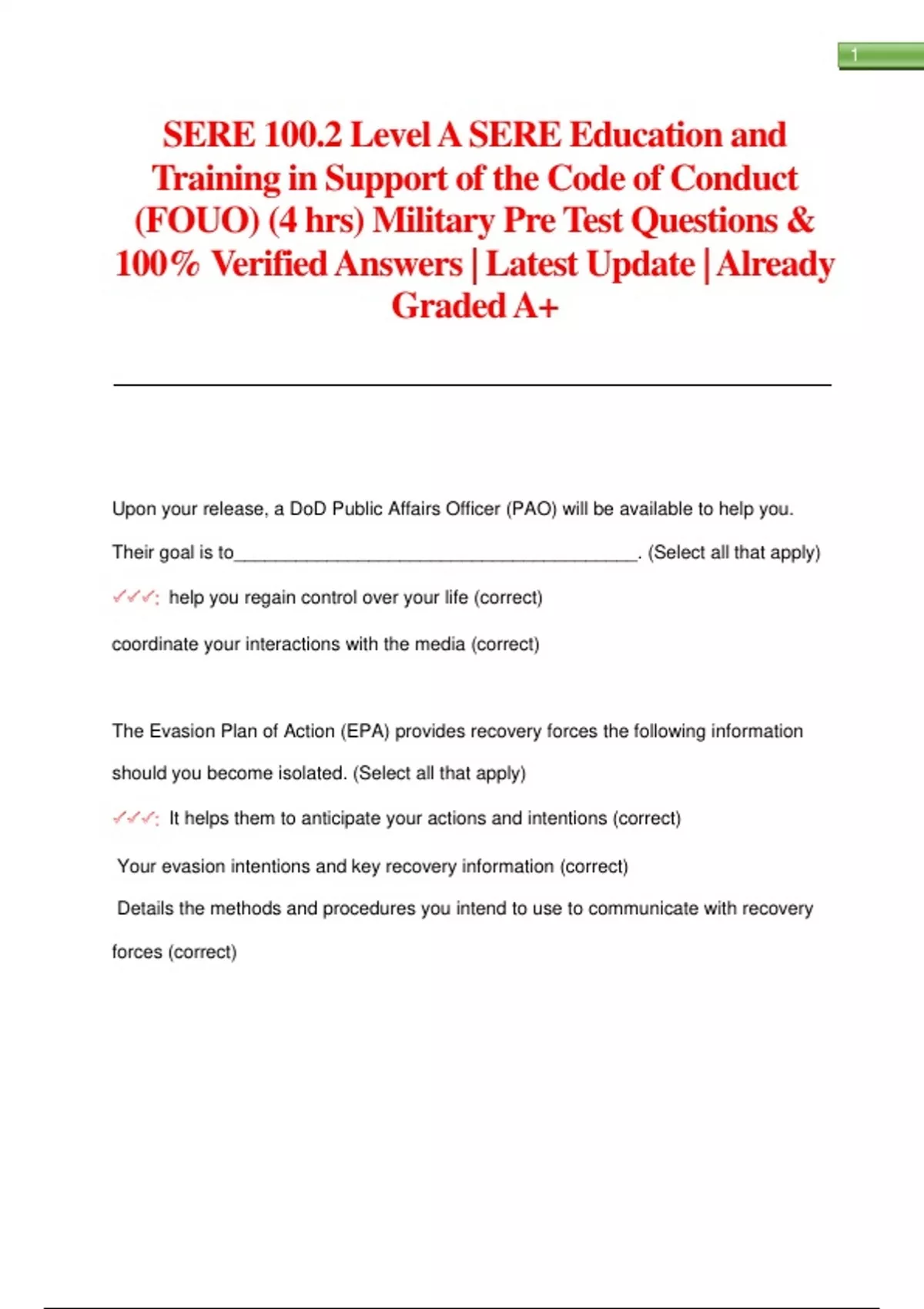 SERE 100.2 Level A SERE Education and Training in Support of the Code of Conduct (FOUO) (4 hrs) Military Pre Test Questions & 100% Verified Answers | Latest Update | Already Graded A+