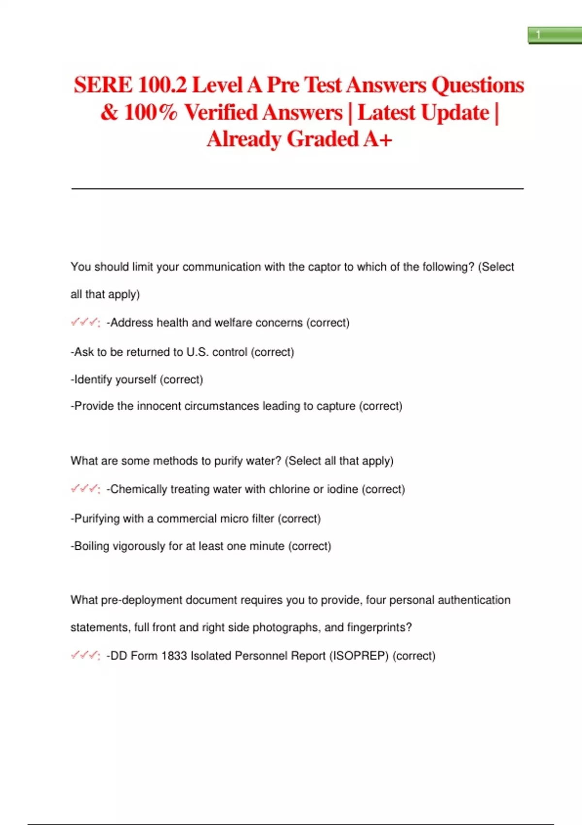 SERE 100.2 Level A Pre Test Answers Questions & 100% Verified Answers | Latest Update | Already Graded A+