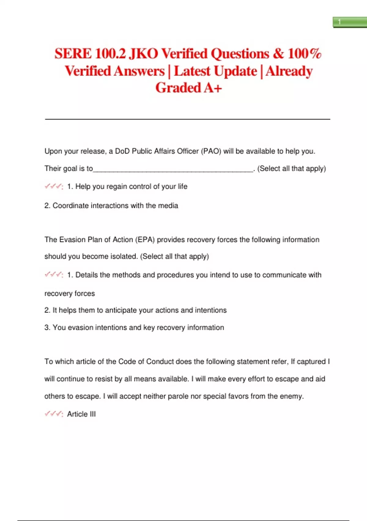 SERE 100.2 JKO Verified Questions & 100% Verified Answers | Latest Update | Already Graded A+