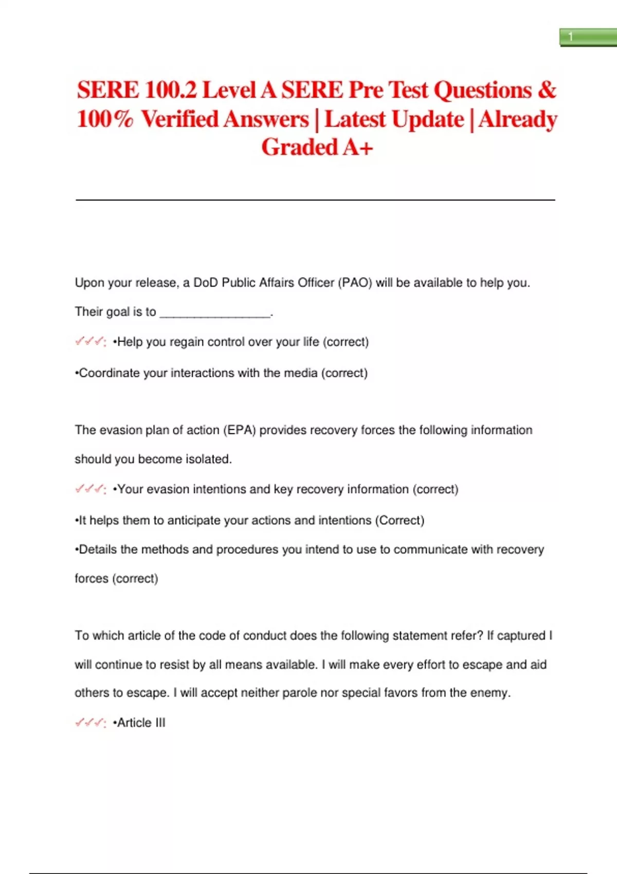 SERE 100.2 Level A SERE Pre Test Questions & 100% Verified Answers | Latest Update | Already Graded A+