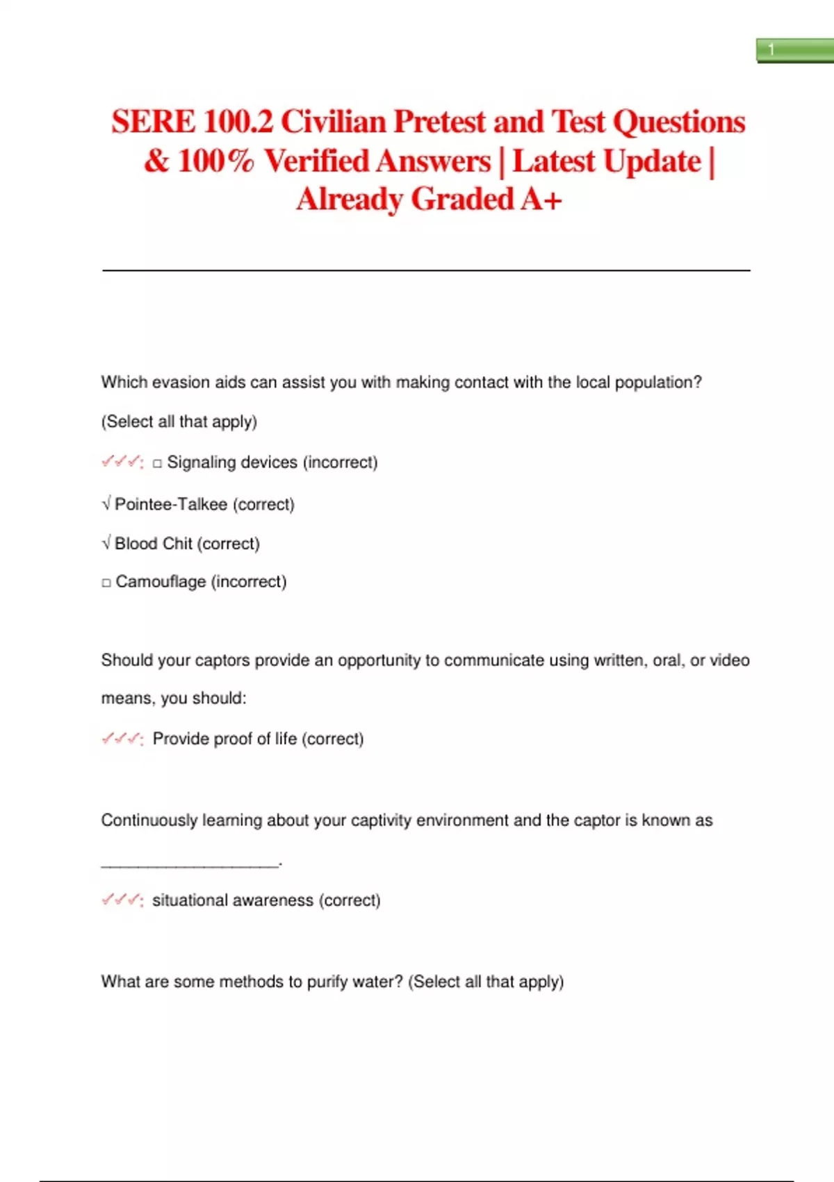 SERE 100.2 Civilian Pretest and Test Questions & 100% Verified Answers | Latest Update | Already Graded A+