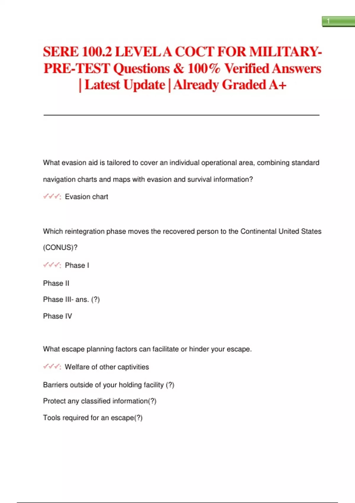 SERE 100.2 LEVEL A COCT FOR MILITARYPRE-TEST Questions & 100% Verified Answers | Latest Update | Already Graded A+