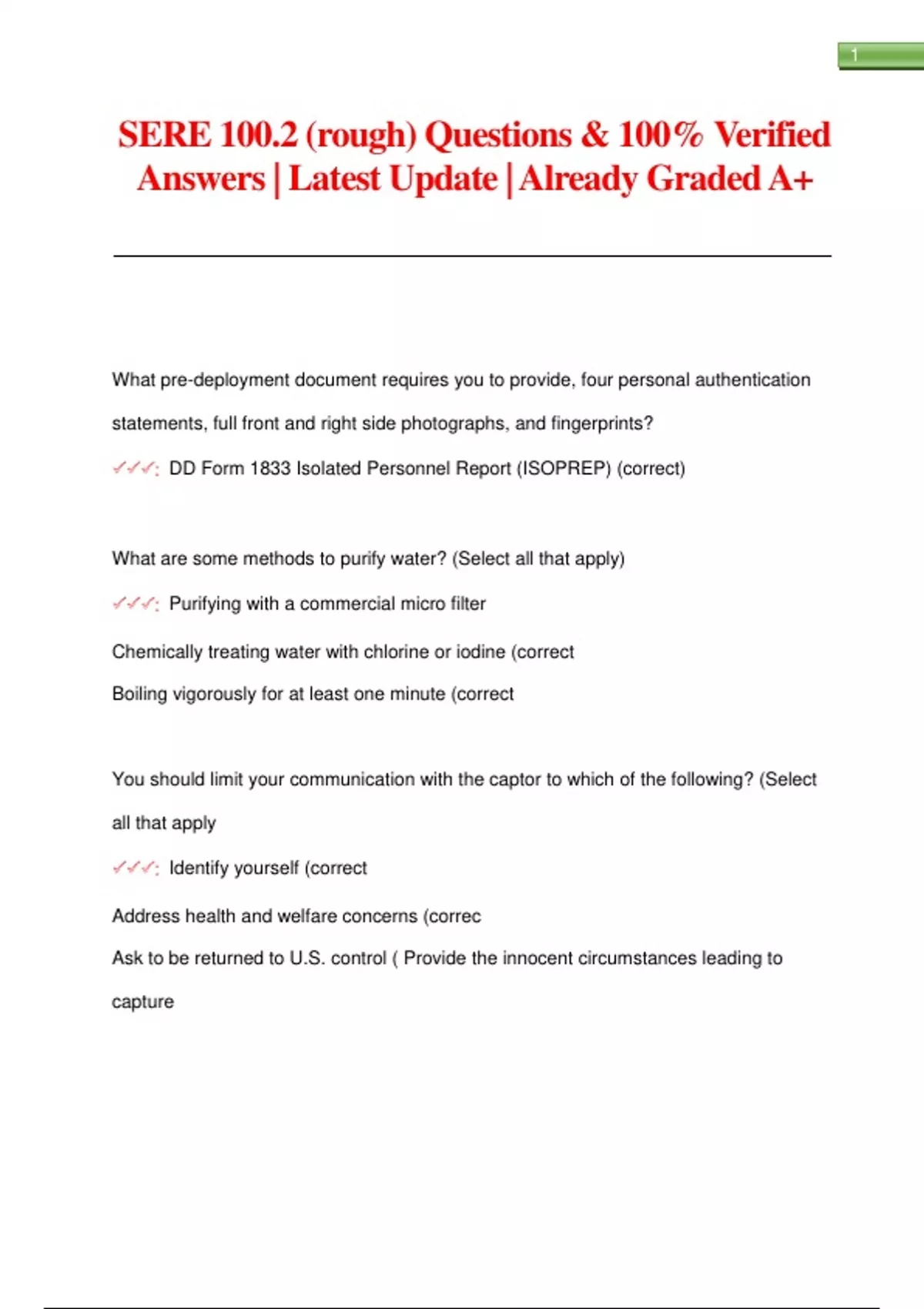 SERE 100.2 (rough) Questions & 100% Verified Answers | Latest Update | Already Graded A+