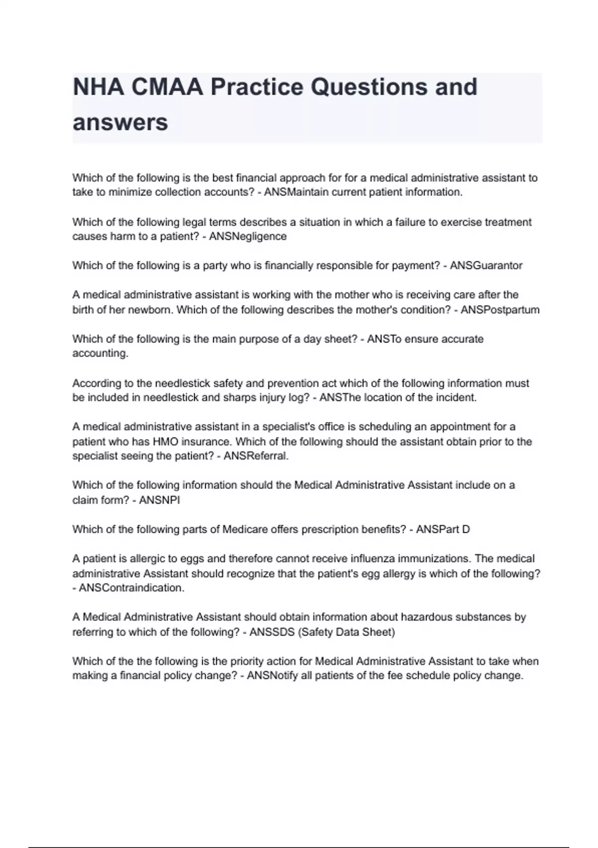 NHA CMAA Practice Questions and answers A+ score assured 2024/2025