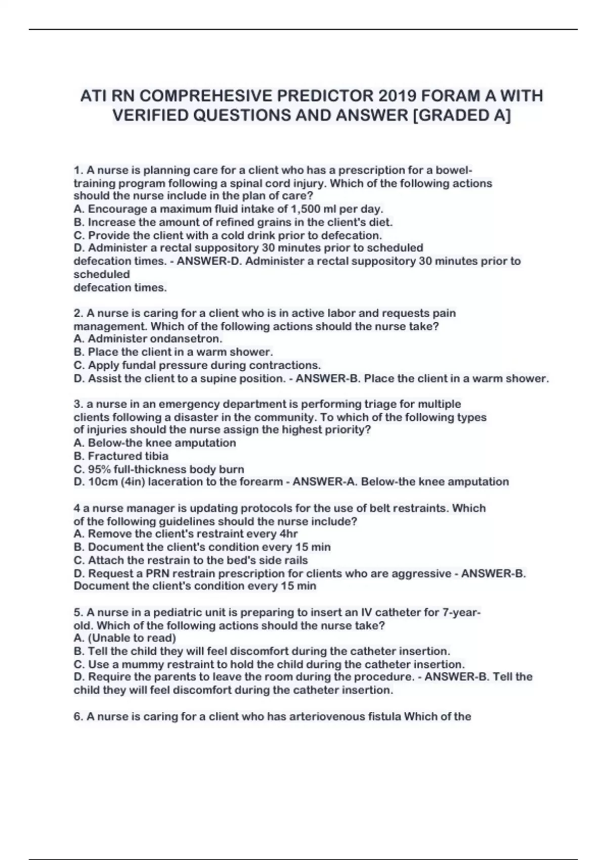 1. A nurse is planning care for a client who has a prescription for a bowel- training program following a spinal cord injury. Which of the following actions should the nurse include in the plan of care? A. Encourage a maximum fluid intake of 1,500 ml per day. B. Increase the amount of refined grains in the client's diet. C. Provide the client with a cold drink prior to defecation. D. Administer a rectal suppository 30 minutes prior to scheduled defecation times. - ANSWER-D. Administer a rectal suppository 30 minutes prior to scheduled defecation times. 2. A nurse is caring for a client who is in active labor and requests pain management. Which of the following actions should the nurse take? A. Administer ondansetron. B. Place the client in a warm shower. C. Apply fundal pressure during contractions. D. Assist the client to a supine position. - ANSWER-B. Place the client in a warm shower. 3. a nurse in an emergency department is performing triage for multiple clients following a disaster in the community. To which of the following types of injuries should the nurse assign the highest priority? A. Below-the knee amputation B. Fractured tibia C. 95% full-thickness body burn D. 10cm (4in) laceration to the forearm - ANSWER-A. Below-the knee amputation 4 a nurse manager is updating protocols for the use of belt restraints. Which of the following guidelines should the nurse include? A. Remove the client's restraint every 4hr B. Document the client's condition every 15 min C. Attach the restrain to the bed's side rails D. Request a PRN restrain prescription for clients who are aggressive - ANSWER-B. Document the client's condition every 15 min 5. A nurse in a pediatric unit is preparing to insert an IV catheter for 7-year- old. Which of the following actions should the nurse take? A. (Unable to read) B. Tell the child they will feel discomfort during the catheter insertion. C. Use a mummy restraint to hold the child during the catheter insertion. D. Require the parents to leave the room during the procedure. - ANSWER-B. Tell the child they will feel discomfort during the catheter insertion.