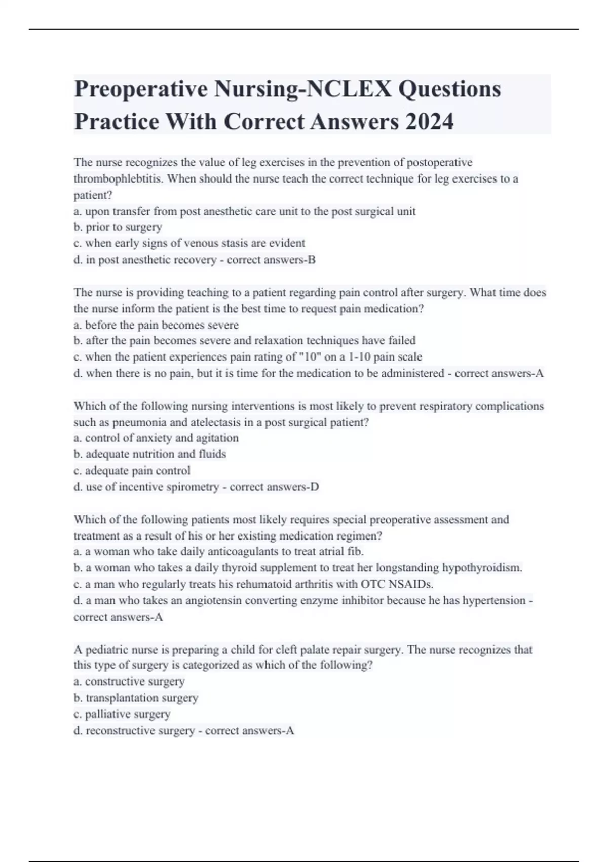 Preoperative Nursing-NCLEX Questions Practice With Correct Answers 2024