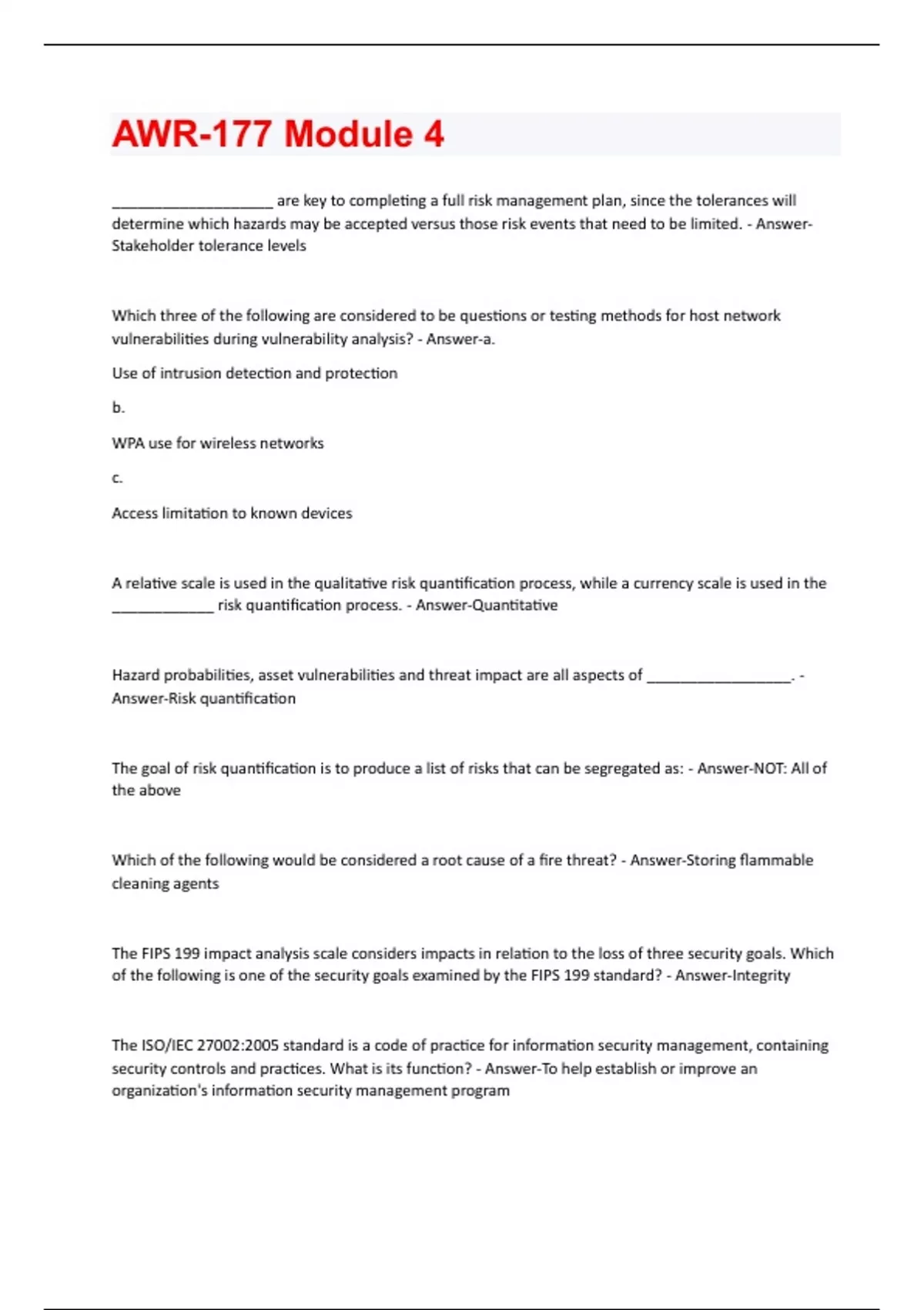 ___________________ are key to completing a full risk management plan, since the tolerances will determine which hazards may be accepted versus those risk events that need to be limited. - AnswerStakeholder tolerance levels Which three of the following are considered to be questions or testing methods for host network vulnerabilities during vulnerability analysis? - Answer-a. Use of intrusion detection and protection b. WPA use for wireless networks c. Access limitation to known devices A relative scale is used in the qualitative risk quantification process, while a currency scale is used in the ____________ risk quantification process. - Answer-Quantitative Hazard probabilities, asset vulnerabilities and threat impact are all aspects of _________________. - Answer-Risk quantification The goal of risk quantification is to produce a list of risks that can be segregated as: - Answer-NOT: All of the above Which of the following would be considered a root cause of a fire threat? - Answer-Storing flammable cleaning agents The FIPS 199 impact analysis scale considers impacts in relation to the loss of three security goals. Which of the following is one of the security goals examined by the FIPS 199 standard? - Answer-Integrity The ISO/IEC 27002:2005 standard is a code of practice for information security management, containing security controls and practices. What is its function? - Answer-To help establish or improve an organization's information security management programWhich is the correct equation for quantitative risk quantification? - Answer-EMV = probability * vulnerability * impact Risk tolerance involves both risk attitude and risk capacity. Risk attitude refers to the organization's _______________________, while risk capacity describes the maximum amount of risk that the organization can assume. - Answer-Willingness to incur risk Risk grading uses what two factors to determine the severity of a hazard? - Answer-NOT: Vulnerability and impact Which of the following is NOT used for determining asset vulnerability? - Answer-NOT: Questionnaires According to the classification of hazards, a black hat hacker would be classified as a ________________. - Answer-Malicious human hazard Which of the following is considered a business risk? - Answer-Investments in stock Which of the following is the formula used for the Failure Mode and Effects Analysis risk quantification method? - Answer-Risk Priority Number = Severity * Likelihood of Occurrence * Detection Inability Which of the following is a method for determining hazard likelihood or probability? - Answer-All of the above Questionnaires, walkthroughs, and penetration testing are all commonly-used methods of determining ________________. - Answer-Asset vulnerability The FIPS 199 impact analysis scale considers impacts in relation to the loss of which three security goals? (Select the three correct answers) - Answer-a. Integrity c. Confidentialityd. Availability The ISO/IEC 27002:2005 standard is a code of practice for information security management, containing security ________________ to help establish or improve an organization's information security management program. - Answer-Controls and practices Which of the following is NOT a goal of risk quantification? - Answer-Determining threat stakeholders According to the classification of hazards, an unlocked door is considered to be a(n) _________________. - Answer-Non-malicious human hazard Which of the following is NOT a method for determining hazard likelihood or probability? - Answer-Asset vulnerability A key factor in risk quantification is ___________. - Answer-Asset vulnerabilities In the formula for the Failure Mode and Effects Analysis risk quantification method, the rated variables (such as severity) range from _______________. The resulting Risk Priority Number ranges from 1 to 1000. - Answer-1 to 10 One risk quantification method compares and examines two factors - impact and probability (likelihood) - to determine the severity of a hazard. What is this method? - Answer-NOT: Risk grading NOT: Risk scenarios
