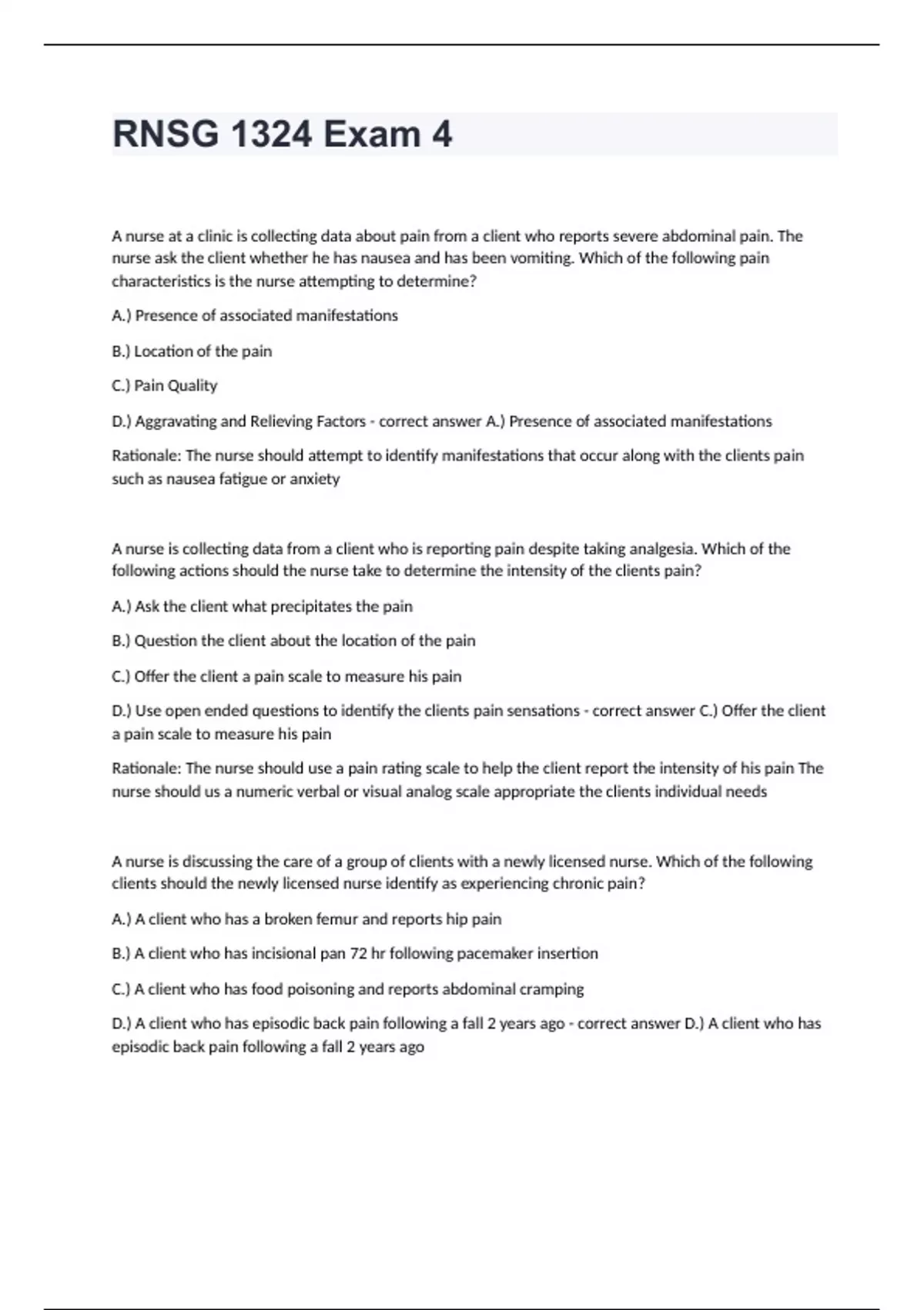 RNSG 1324 Exam 4A nurse at a clinic is collecting data about pain from a client who reports severe abdominal pain. The nurse ask the client whether he has nausea and has been vomiting. Which of the following pain characteristics is the nurse attempting to determine? A.) Presence of associated manifestations B.) Location of the pain C.) Pain Quality D.) Aggravating and Relieving Factors - correct answer A.) Presence of associated manifestations Rationale: The nurse should attempt to identify manifestations that occur along with the clients pain such as nausea fatigue or anxiety A nurse is collecting data from a client who is reporting pain despite taking analgesia. Which of the following actions should the nurse take to determine the intensity of the clients pain? A.) Ask the client what precipitates the pain B.) Question the client about the location of the pain C.) Offer the client a pain scale to measure his pain D.) Use open ended questions to identify the clients pain sensations - correct answer C.) Offer the client a pain scale to measure his pain Rationale: The nurse should use a pain rating scale to help the client report the intensity of his pain The nurse should us a numeric verbal or visual analog scale appropriate the clients individual needs A nurse is discussing the care of a group of clients with a newly licensed nurse. Which of the following clients should the newly licensed nurse identify as experiencing chronic pain? A.) A client who has a broken femur and reports hip pain B.) A client who has incisional pan 72 hr following pacemaker insertion C.) A client who has food poisoning and reports abdominal cramping D.) A client who has episodic back pain following a fall 2 years ago - correct answer D.) A client who has episodic back pain following a fall 2 years ago