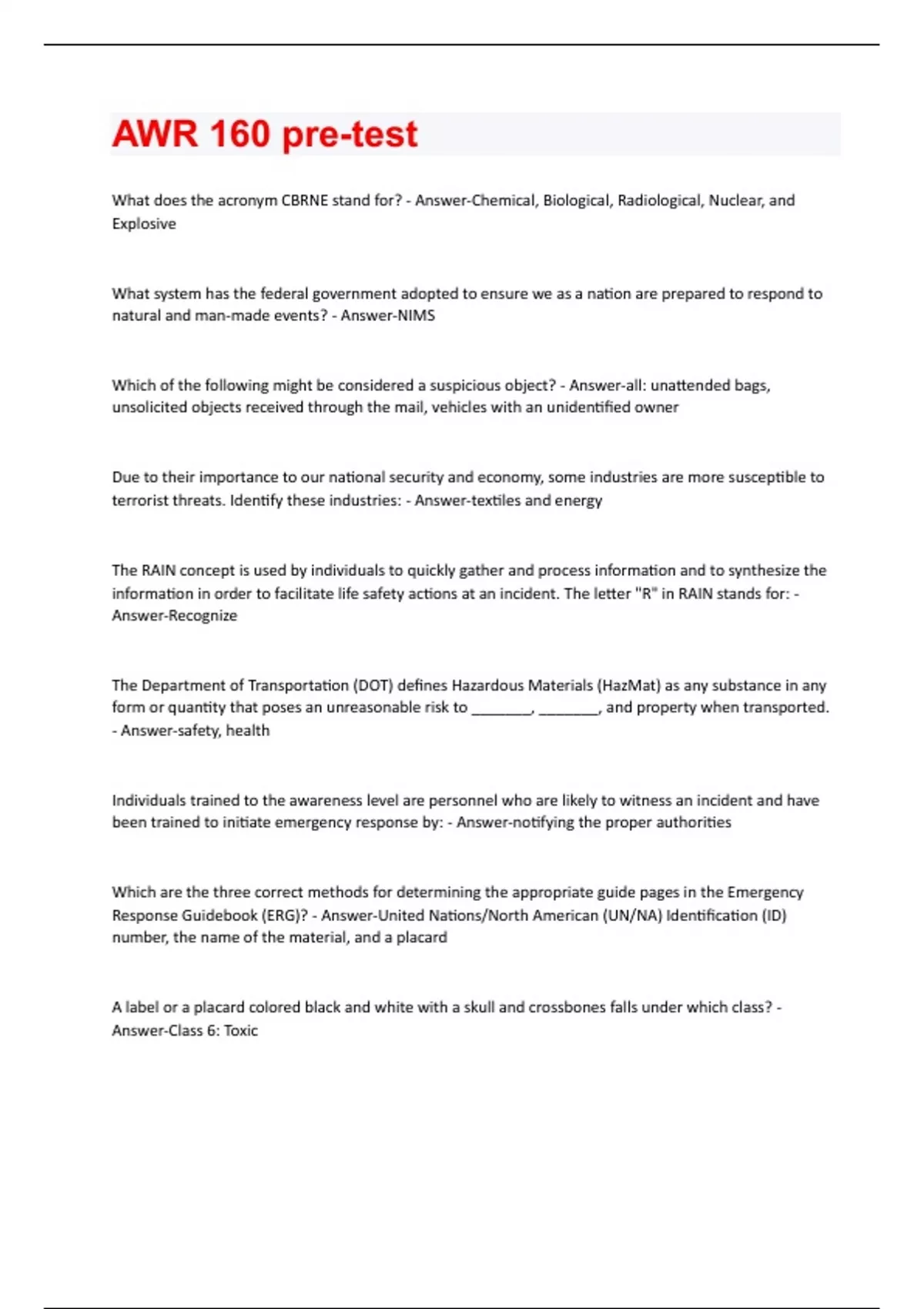 What does the acronym CBRNE stand for? - Answer-Chemical, Biological, Radiological, Nuclear, and Explosive What system has the federal government adopted to ensure we as a nation are prepared to respond to natural and man-made events? - Answer-NIMS Which of the following might be considered a suspicious object? - Answer-all: unattended bags, unsolicited objects received through the mail, vehicles with an unidentified owner Due to their importance to our national security and economy, some industries are more susceptible to terrorist threats. Identify these industries: - Answer-textiles and energy The RAIN concept is used by individuals to quickly gather and process information and to synthesize the information in order to facilitate life safety actions at an incident. The letter "R" in RAIN stands for: - Answer-Recognize The Department of Transportation (DOT) defines Hazardous Materials (HazMat) as any substance in any form or quantity that poses an unreasonable risk to _______, _______, and property when transported. - Answer-safety, health Individuals trained to the awareness level are personnel who are likely to witness an incident and have been trained to initiate emergency response by: - Answer-notifying the proper authorities Which are the three correct methods for determining the appropriate guide pages in the Emergency Response Guidebook (ERG)? - Answer-United Nations/North American (UN/NA) Identification (ID) number, the name of the material, and a placard A label or a placard colored black and white with a skull and crossbones falls under which class? - Answer-Class 6: ToxicWhich of the following is not usually found on a pipeline marker? - Answer-National Fire Protection Association (NFPA) 704 diamond Labels and placards are one of the basic clues for identifying Hazardous Materials (HazMat) incidents. __________ are defined as symbols affixed to the package being shipped. __________ are defined as larger symbols that are applied to the sides and end of a vehicle, railcar, freight container, or portable tank containing hazardous materials. - Answer-Labels; Placards Due to changes in humidity, temperature, and wind speed, isolation distances will always be greater: - Answer-? at night Use the Emergency Response Guidebook (ERG) to answer the following question. You respond to a highway incident in which a truck has been rear-ended, and squares of a white, fibrous substance are strewn across the roadway. You are able to speak to the driver, and his bill of lading identifies the cargo as white asbestos. What guide number is assigned to this material? - Answer-171 Use the Emergency Response Guidebook (ERG) to answer the following question. According to the ERG, are you required to refer to Table 1: Initial Isolation and Protective Action Distances for this material? - Answer-no Use the Emergency Response Guidebook (ERG) to answer the following question. As an immediate precautionary measure, how far should you isolate the spill in all directions? - Answer- 75 feet (25 meters) What is the least reliable identification method and poses the highest risk for exposure? - Answer-smell or taste There are four types of Chemical Warfare Agents (CWA). Which CWA prevents blood from providing oxygen to tissues and organs? - Answer-blood agent Common sources in the community where Toxic Industrial Chemicals (TIC) can be found include which of the following locations? - Answer-all: shipyards, food processing and storage facilities, and manufacturing plantsIdentifying other possible indicators of terrorist attacks. - Answer-Laboratory equipment not relevant to the building occupancy Which control zone includes control points for the access corridor, and thus assists in reducing the spread of contamination? - Answer-warm zone