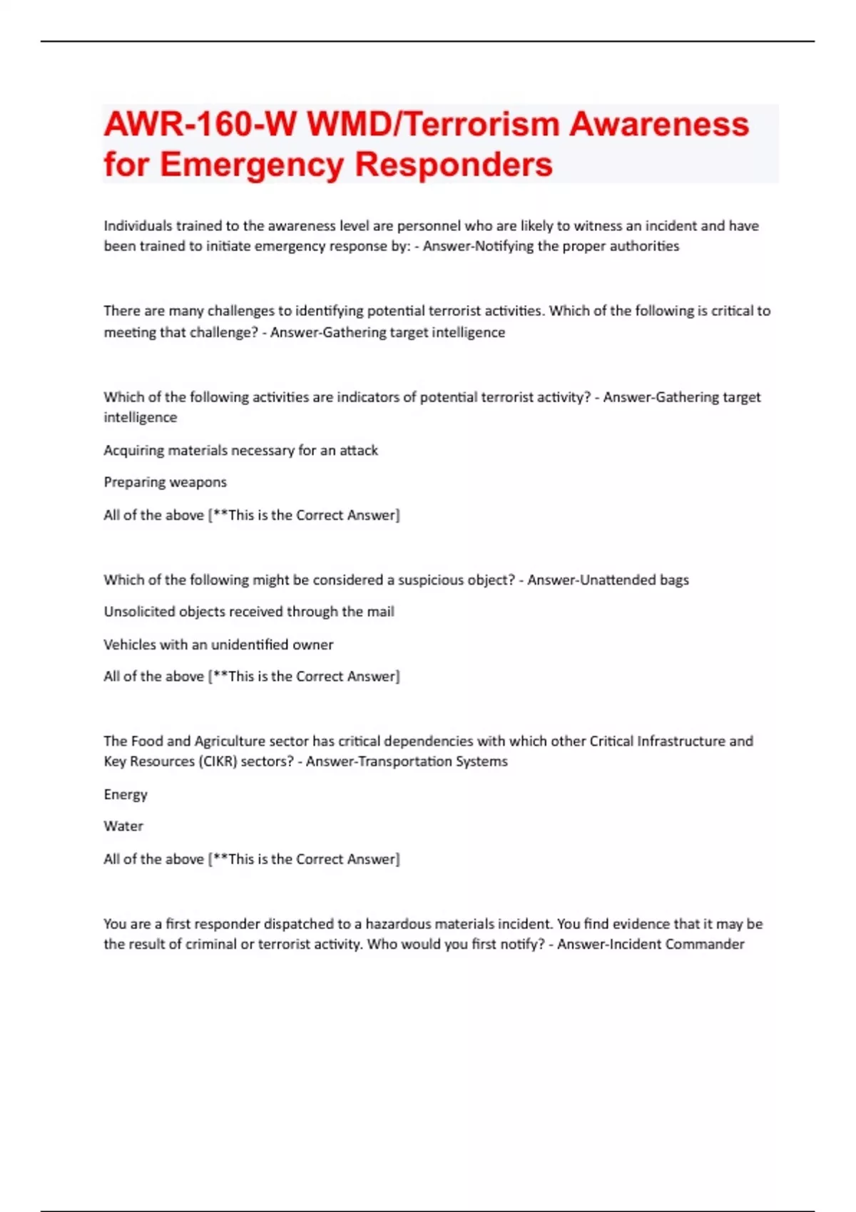 Individuals trained to the awareness level are personnel who are likely to witness an incident and have been trained to initiate emergency response by: - Answer-Notifying the proper authorities There are many challenges to identifying potential terrorist activities. Which of the following is critical to meeting that challenge? - Answer-Gathering target intelligence Which of the following activities are indicators of potential terrorist activity? - Answer-Gathering target intelligence Acquiring materials necessary for an attack Preparing weapons All of the above [**This is the Correct Answer] Which of the following might be considered a suspicious object? - Answer-Unattended bags Unsolicited objects received through the mail Vehicles with an unidentified owner All of the above [**This is the Correct Answer] The Food and Agriculture sector has critical dependencies with which other Critical Infrastructure and Key Resources (CIKR) sectors? - Answer-Transportation Systems Energy Water All of the above [**This is the Correct Answer] You are a first responder dispatched to a hazardous materials incident. You find evidence that it may be the result of criminal or terrorist activity. Who would you first notify? - Answer-Incident CommanderWhat is the primary consideration when encountering a hazardous material or Weapon of Mass Destruction (WMD) release? - Answer-Recognize the hazard/threat The acronym RAIN represents several action steps to help responders at a Hazardous Material/Weapons of Mass Destruction (HazMat/WMD) incident. What are these action steps? - Answer-Recognize, Avoid, Isolate, and Notify The RAIN concept is used by individuals to quickly gather and process information and to synthesize the information in order to facilitate life safety actions at an incident. The letter "A" in RAIN stands for: - Answer-Avoid Which one of these government agencies establishes the nation's overall transportation policies? - Answer-Department of Transportation (DOT) A label or placard with a three-bladed fan usually refers to which class? - Answer-Radioactive A label or a placard colored black and white with a skull and crossbones falls under which class? - Answer-Class 6 - Toxic In detecting clues to the presence of hazardous materials at the scene of an incident, using the sense of touch, taste, or __________ is not recommended. - Answer-Smell Protective actions are "those steps taken to safeguard the health and safety of emergency responders and the public during an incident involving releases of dangerous goods" (DOT 2012, pg. 288). Protective actions are listed in the green- and ____________ -bordered pages of the Emergency Response Guidebook (ERG). - Answer-Orange In the Emergency Response Guidebook (ERG), there are two ways to identify material: United Nations ID number (yellow section) or the printed name of the material (blue section). - Answer-True The National Fire Protection Association (NFPA) 704 fixed facility markings are ______-shaped signs. - Answer-DiamondThe bill of lading is normally found in the: - Answer-Cab of the truck Shipping papers used during rail transportation of a hazardous material are called a: - Answer-Consist or waybill