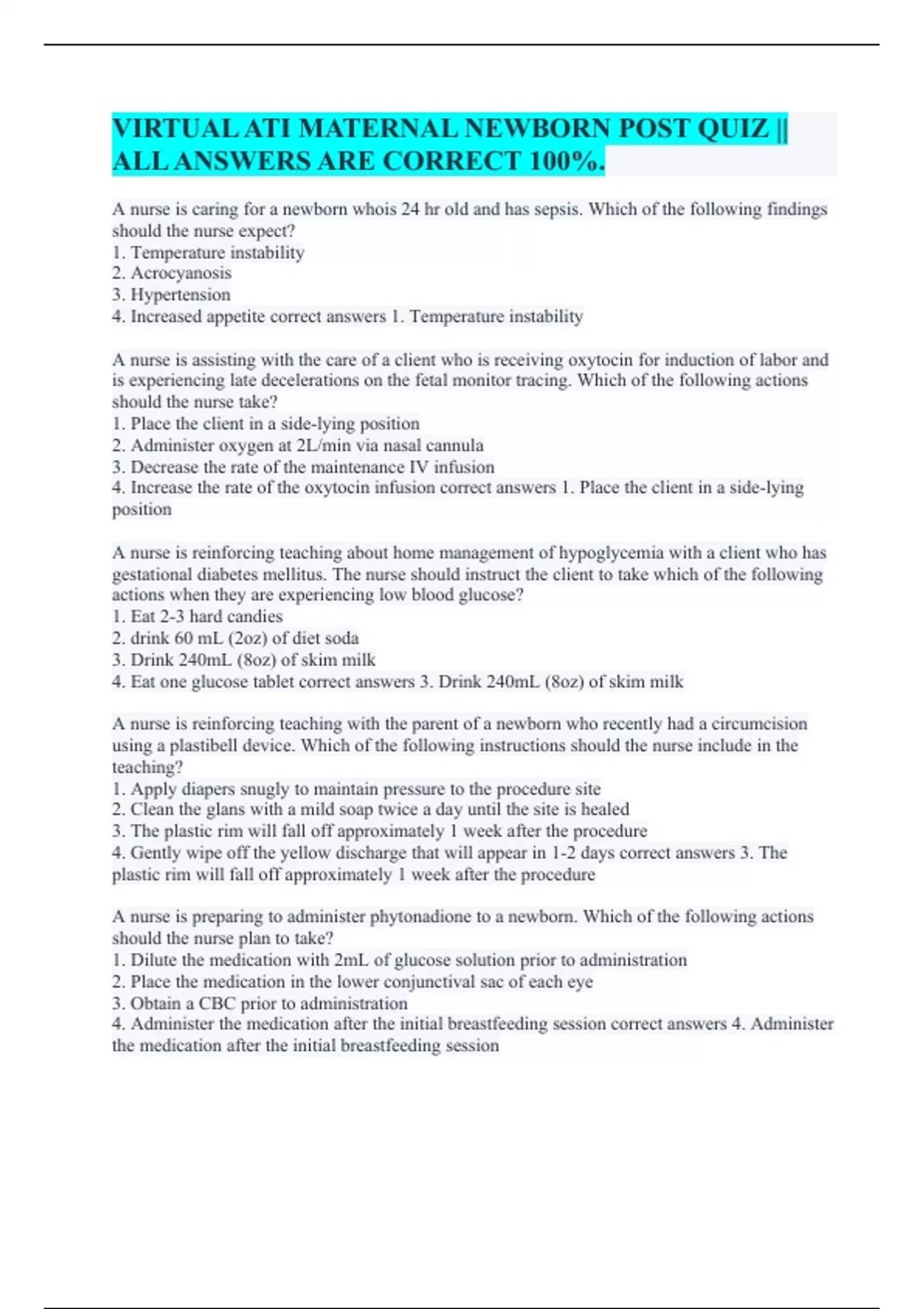 VIRTUAL ATI MATERNAL NEWBORN POST QUIZ || ALL ANSWERS ARE CORRECT 100%.