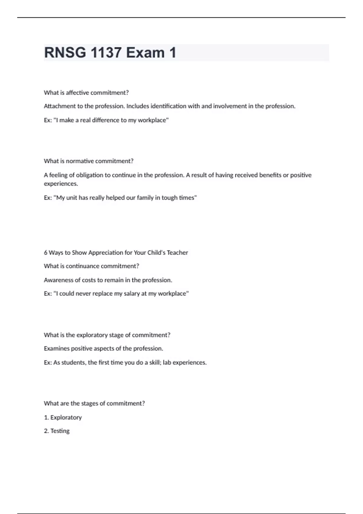 RNSG 1137 Exam 1What is affective commitment? Attachment to the profession. Includes identification with and involvement in the profession. Ex: "I make a real difference to my workplace" What is normative commitment? A feeling of obligation to continue in the profession. A result of having received benefits or positive experiences. Ex: "My unit has really helped our family in tough times" 6 Ways to Show Appreciation for Your Child's Teacher What is continuance commitment? Awareness of costs to remain in the profession. Ex: "I could never replace my salary at my workplace" What is the exploratory stage of commitment? Examines positive aspects of the profession. Ex: As students, the first time you do a skill; lab experiences. What are the stages of commitment? 1. Exploratory 2. Testing