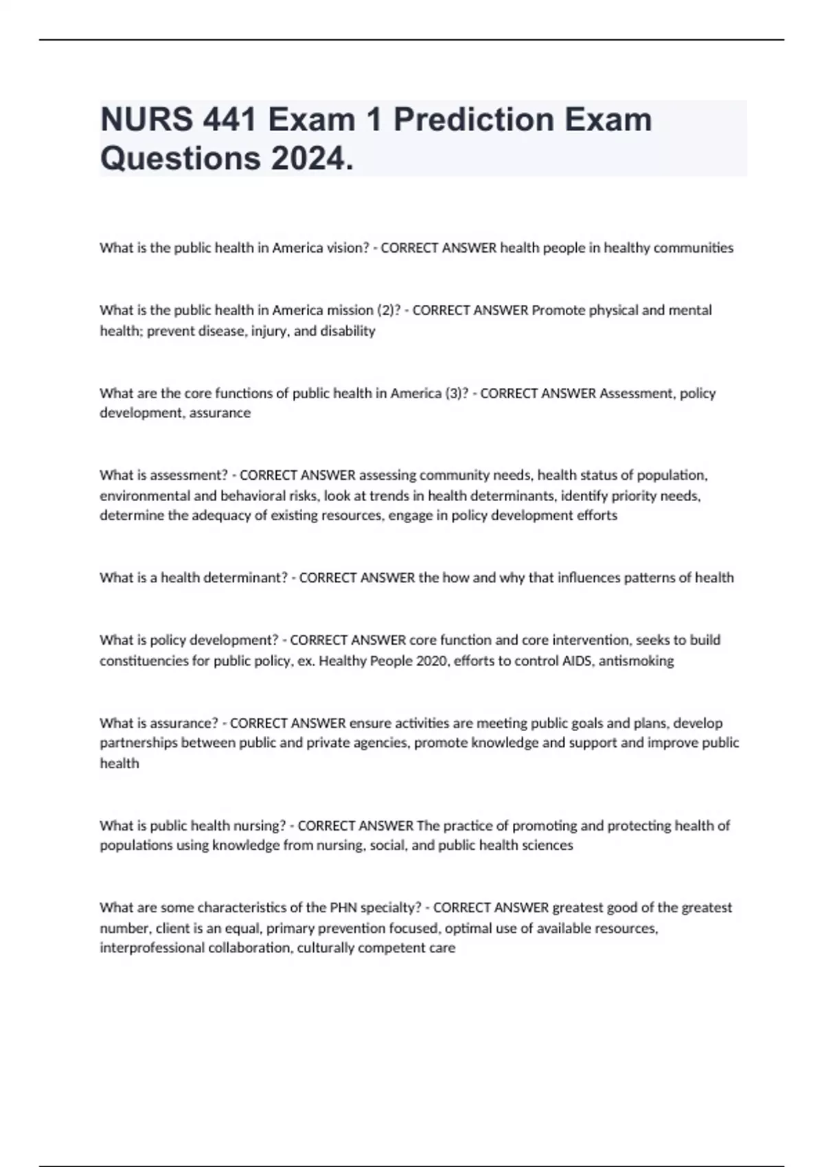 NURS 441 Exam 1 Prediction Exam Questions 2024. What is the public health in America vision? - CORRECT ANSWER health people in healthy communities What is the public health in America mission (2)? - CORRECT ANSWER Promote physical and mental health; prevent disease, injury, and disability What are the core functions of public health in America (3)? - CORRECT ANSWER Assessment, policy development, assurance What is assessment? - CORRECT ANSWER assessing community needs, health status of population, environmental and behavioral risks, look at trends in health determinants, identify priority needs, determine the adequacy of existing resources, engage in policy development efforts What is a health determinant? - CORRECT ANSWER the how and why that influences patterns of health What is policy development? - CORRECT ANSWER core function and core intervention, seeks to build constituencies for public policy, ex. Healthy People 2020, efforts to control AIDS, antismoking What is assurance? - CORRECT ANSWER ensure activities are meeting public goals and plans, develop partnerships between public and private agencies, promote knowledge and support and improve public health What is public health nursing? - CORRECT ANSWER The practice of promoting and protecting health of populations using knowledge from nursing, social, and public health sciences What are some characteristics of the PHN specialty? - CORRECT ANSWER greatest good of the greatest number, client is an equal, primary prevention focused, optimal use of available resources, interprofessional collaboration, culturally competent care What are four concepts of public health theory? - CORRECT ANSWER Population, Prevention, Risk-reduction, Social justice What are the three levels of prevention? - CORRECT ANSWER Primary- education, secondary-screening, tertiary-support What is social justice? - CORRECT ANSWER All persons are entitled to have their basic needs met What are the four principles of PHN? - CORRECT ANSWER Emphasize primary prevention, greatest good for the greatest number, recognize the client as partner, uses resources wisely to promote best outcomes Ethical Principles for Public Health (6)? - CORRECT ANSWER Respect, autonomy, non-maleficence, beneficence, distributive justice, social justice