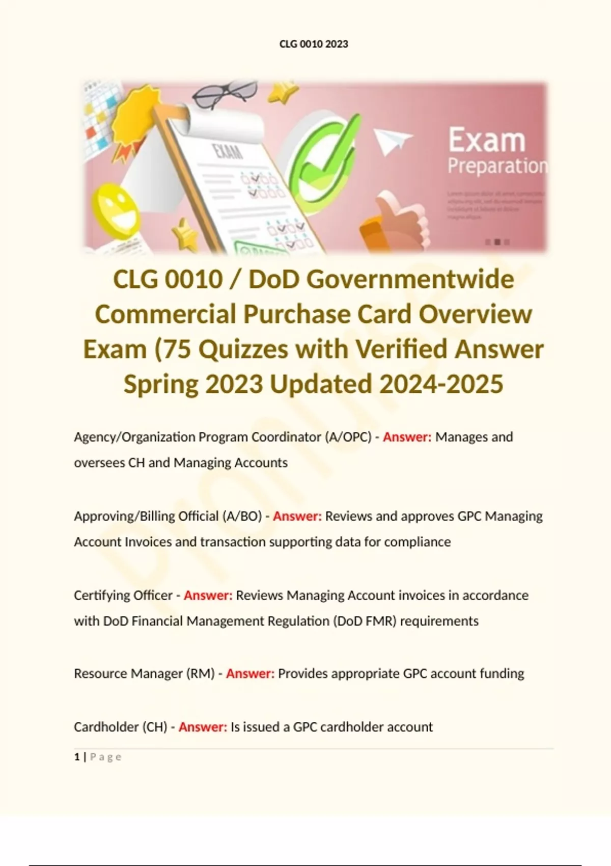 CLG 0010 / DoD Governmentwide Commercial Purchase Card Overview Exam Spring 2023 (75 Quizzes with Verified Answer) Updated .