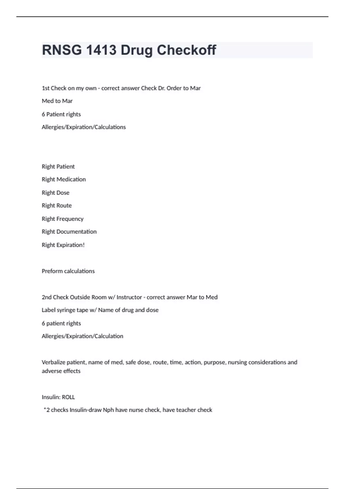 RNSG 1413 Drug Checkoff Question and answers correctly solved RNSG 1413 Drug Checkoff 1st Check on my own - correct answer Check Dr. Order to Mar Med to Mar 6 Patient rights Allergies/Expiration/Calculations Right Patient Right Medication Right Dose Right Route Right Frequency Right Documentation Right Expiration! Preform calculations 2nd Check Outside Room w/ Instructor - correct answer Mar to Med Label syringe tape w/ Name of drug and dose 6 patient rights Allergies/Expiration/Calculation Verbalize patient, name of med, safe dose, route, time, action, purpose, nursing considerations and adverse effects Insulin: ROLL *2 checks Insulin-draw Nph have nurse check, have teacher check draw Regular have