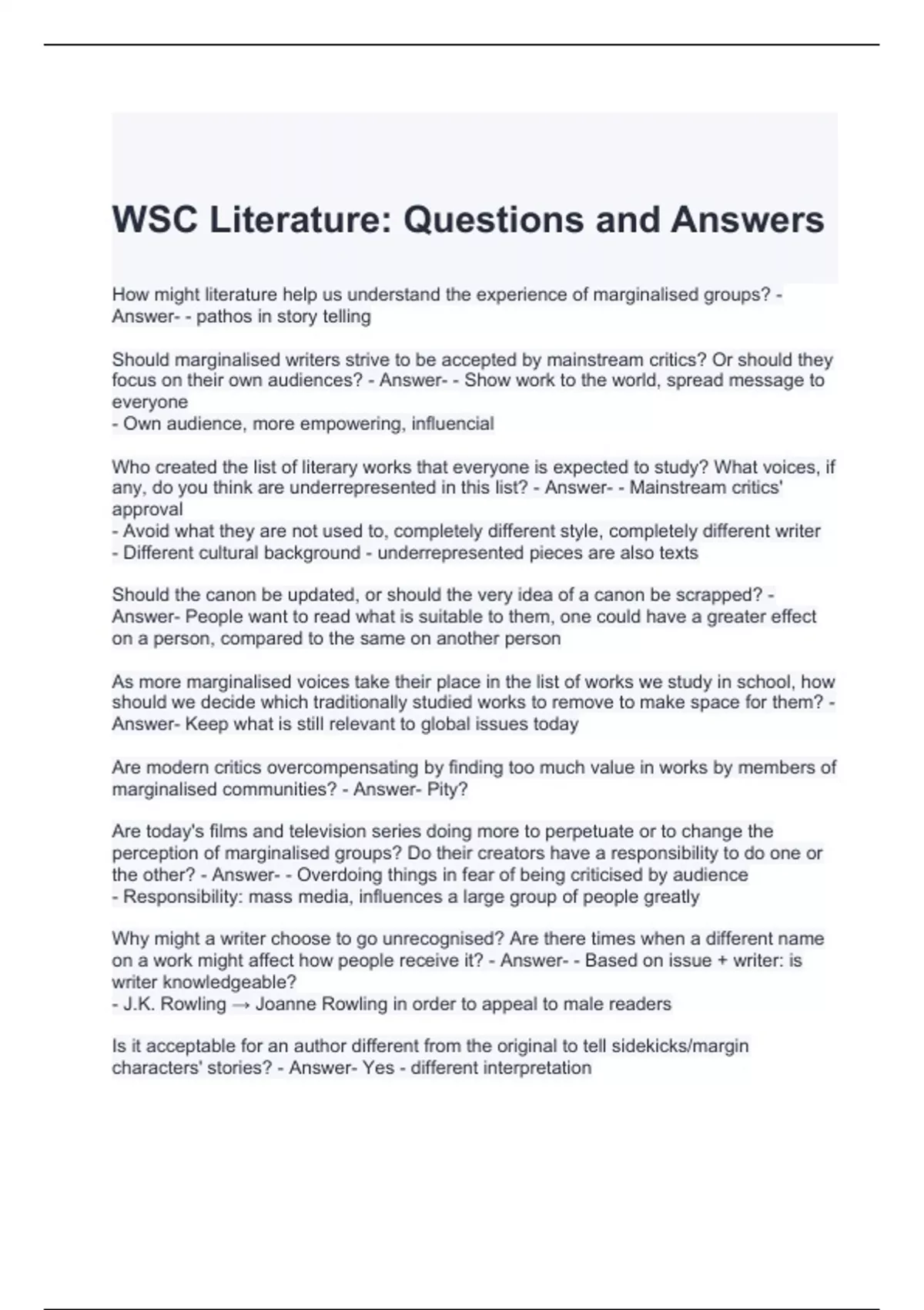 WSC Literature Questions and Answers