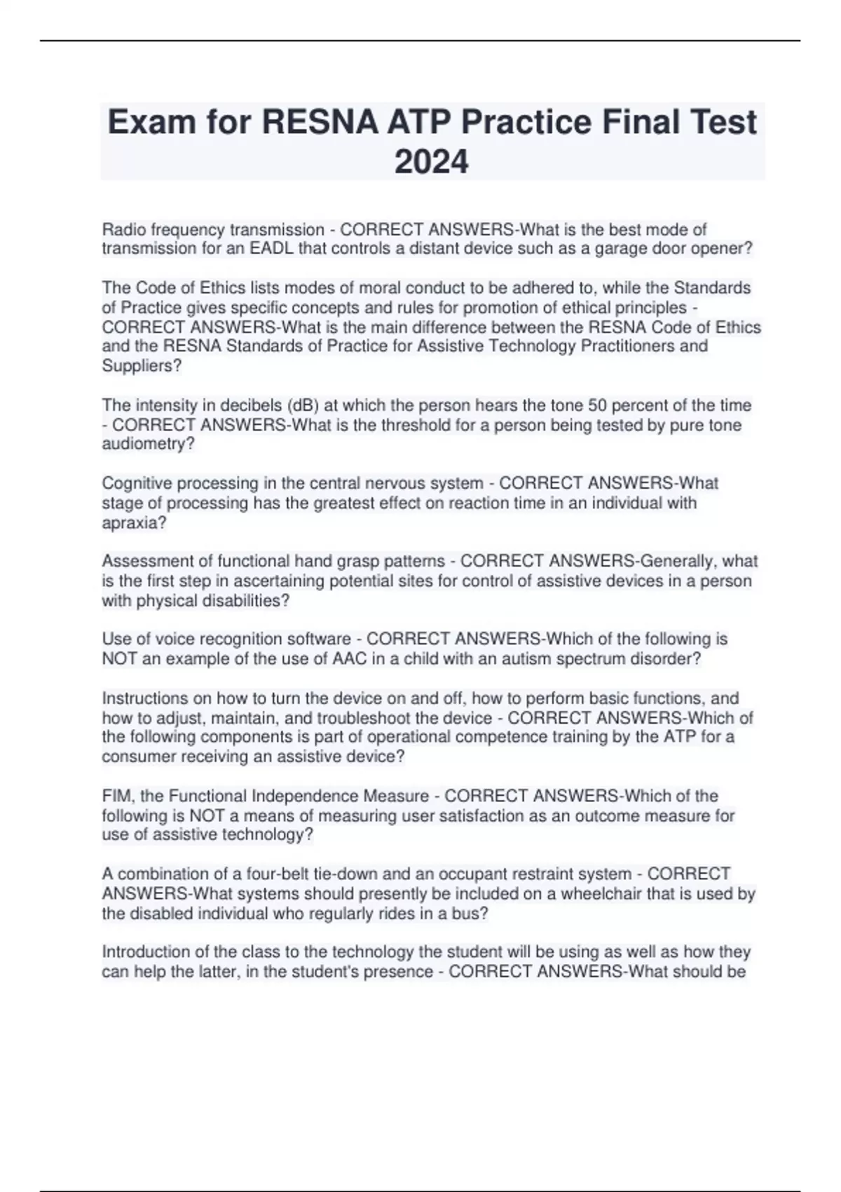 Exam for RESNA ATP Practice Final Test 2024 Radio frequency transmission - CORRECT ANSWERS-What is the best mode of transmission for an EADL that controls a distant device such as a garage door opener? The Code of Ethics lists modes of moral conduct to be adhered to, while the Standards of Practice gives specific concepts and rules for promotion of ethical principles - CORRECT ANSWERS-What is the main difference between the RESNA Code of Ethics and the RESNA Standards of Practice for Assistive Technology Practitioners and Suppliers? The intensity in decibels (dB) at which the person hears the tone 50 percent of the time - CORRECT ANSWERS-What is the threshold for a person being tested by pure tone audiometry?