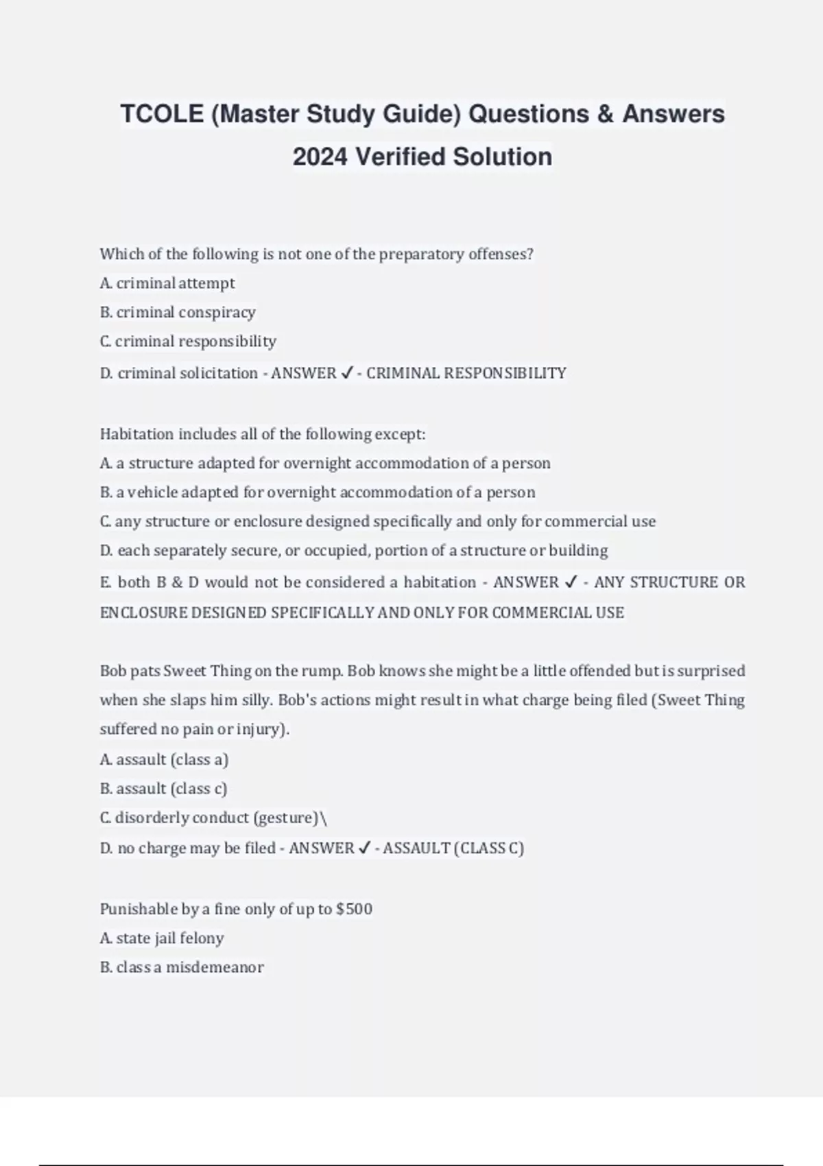 TCOLE (Master Study Guide) Questions & Answers 2024 Verified Solution Which of the following is not one of the preparatory offenses? A. criminal attempt B. criminal conspiracy C. criminal responsibility D. criminal solicitation - ANSWER - CRIMINAL RESPONSIBILITY Habitation includes all of the following except: A. a structure adapted for overnight accommodation of a person B. a vehicle adapted for overnight accommodation of a person C. any structure or enclosure designed specifically and only for commercial use D. each separately secure, or occupied, portion of a structure or building E. both B & D would not be considered a habitation - ANSWER - ANY STRUCTURE OR ENCLOSURE DESIGNED SPECIFICALLY AND ONLY FOR COMMERCIAL USE Bob pats Sweet Thing on the rump. Bob knows she might be a little offended but is surprised when she slaps him silly. Bob's actions might result in what charge being filed (Sweet Thing suffered no pain or injury). A. assault (class a) B. assault (class c) C. disorderly conduct (gesture) D. no charge may be filed - ANSWER - ASSAULT (CLASS C) Punishable by a fine only of up to $500 A. state jail felony B. class a misdemeanor C. class b misdemeanor D. class c misdemeanor - ANSWER - CLASS C MISDEMEANOR When a person causes the penetration of the anus or female sexual organ of another person who is not the spouse of the actor by any means, without the person's consent, they have committed the offense of: A. assault B. sexual assault C. aggravated sexual assault D. rape - ANSWER - SEXUAL ASSAULT Romeo gives Juliet (an adult) an aphrodisiac - a drug which stimulates sexual desires - without her knowledge. Juliet is so overwhelmed that she has sexual intercourse with Romeo even though she had always refused his advances before. Romeo may be charged with: A. assault B. aggravated assault C. sexual assault D. aggravated sexual assault - ANSWER - SEXUAL ASSAULT A convicted felon may never possess a firearm. A. true B. false - ANSWER - FALSE Cadet Jones did not study for his Penal Code test. In order to gain more time for study, he calls the Academy office and states "a bomb will go off there in 20 minutes". Cadet Jones may be charged with: A. reckless conduct B. false report to peace officer C. disorderly conduct: hindering proceedings D. hoax bomb E. terroristic threat - ANSWER - TERRORISTIC THREAT Punishable by confinement in a state jail for not more than two years but less than 180 days and, in addition to, may be fined up to $10,000. A. state jail felony B. class a misdemeanor C. class b misdemeanor D. 3rd degree felony - ANSWER - STATE JAIL FELONY