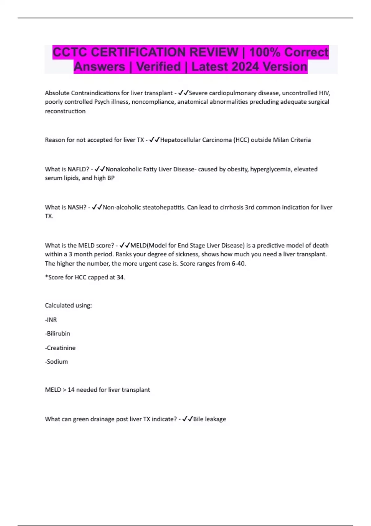 Absolute Contraindications for liver transplant - Severe cardiopulmonary disease, uncontrolled HIV, poorly controlled Psych illness, noncompliance, anatomical abnormalities precluding adequate surgical reconstruction Reason for not accepted for liver TX - Hepatocellular Carcinoma (HCC) outside Milan Criteria What is NAFLD? - Nonalcoholic Fatty Liver Disease- caused by obesity, hyperglycemia, elevated serum lipids, and high BP What is NASH? - Non-alcoholic steatohepatitis. Can lead to cirrhosis 3rd common indication for liver TX. What is the MELD score? - MELD(Model for End Stage Liver Disease) is a predictive model of death within a 3 month period. Ranks your degree of sickness, shows how much you need a liver transplant. The higher the number, the more urgent case is. Score ranges from 6-40. *Score for HCC capped at 34. Calculated using: -INR -Bilirubin -Creatinine