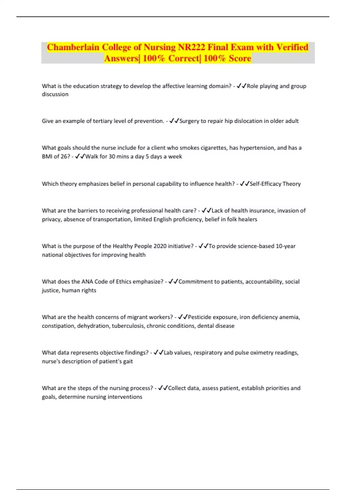 Chamberlain College of Nursing NR222 Final Exam with Verified Answers| 100% Correct| 100% Scor
