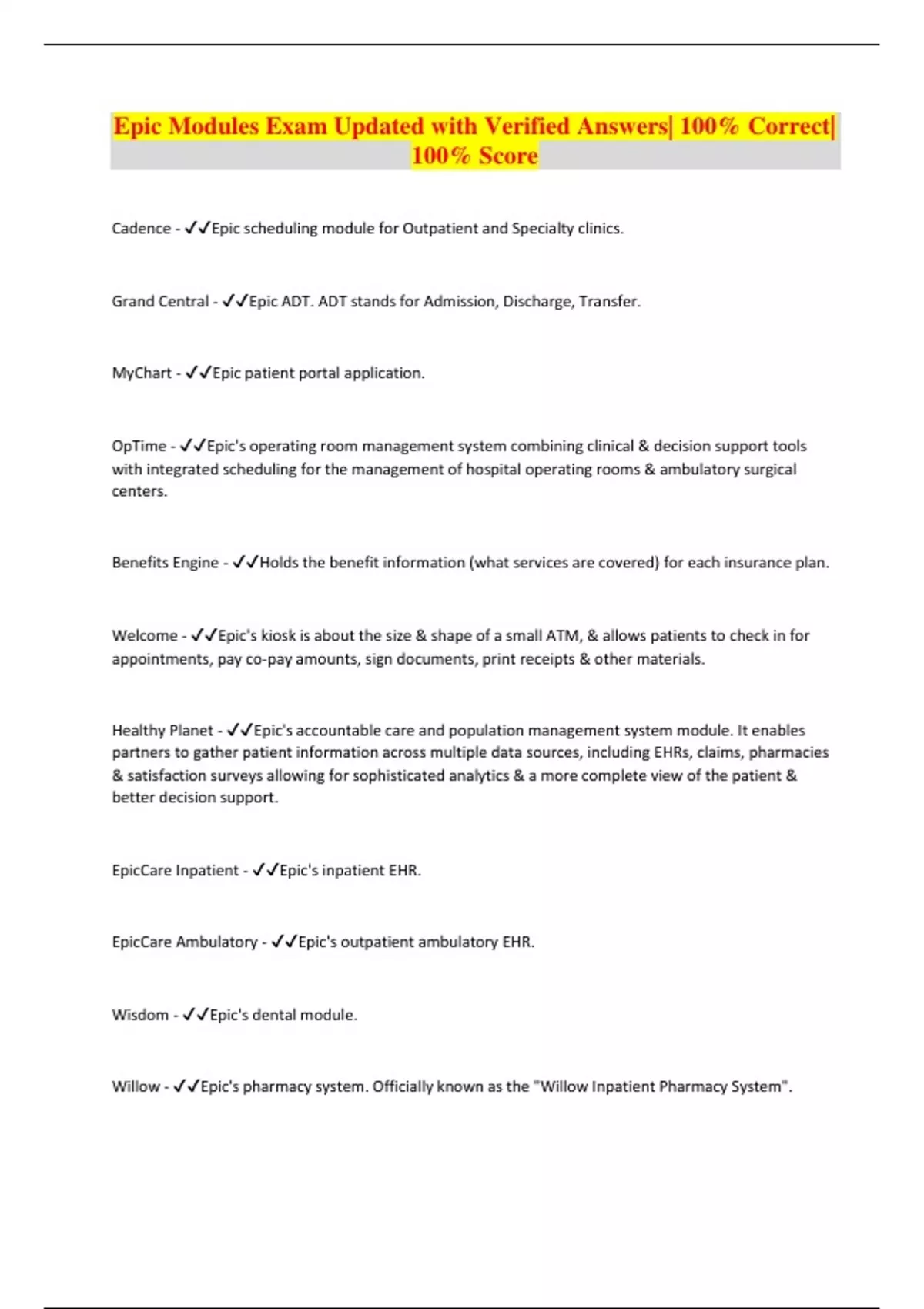 Epic Modules Exam Updated with Verified Answers| 100% Correct| 100% Score