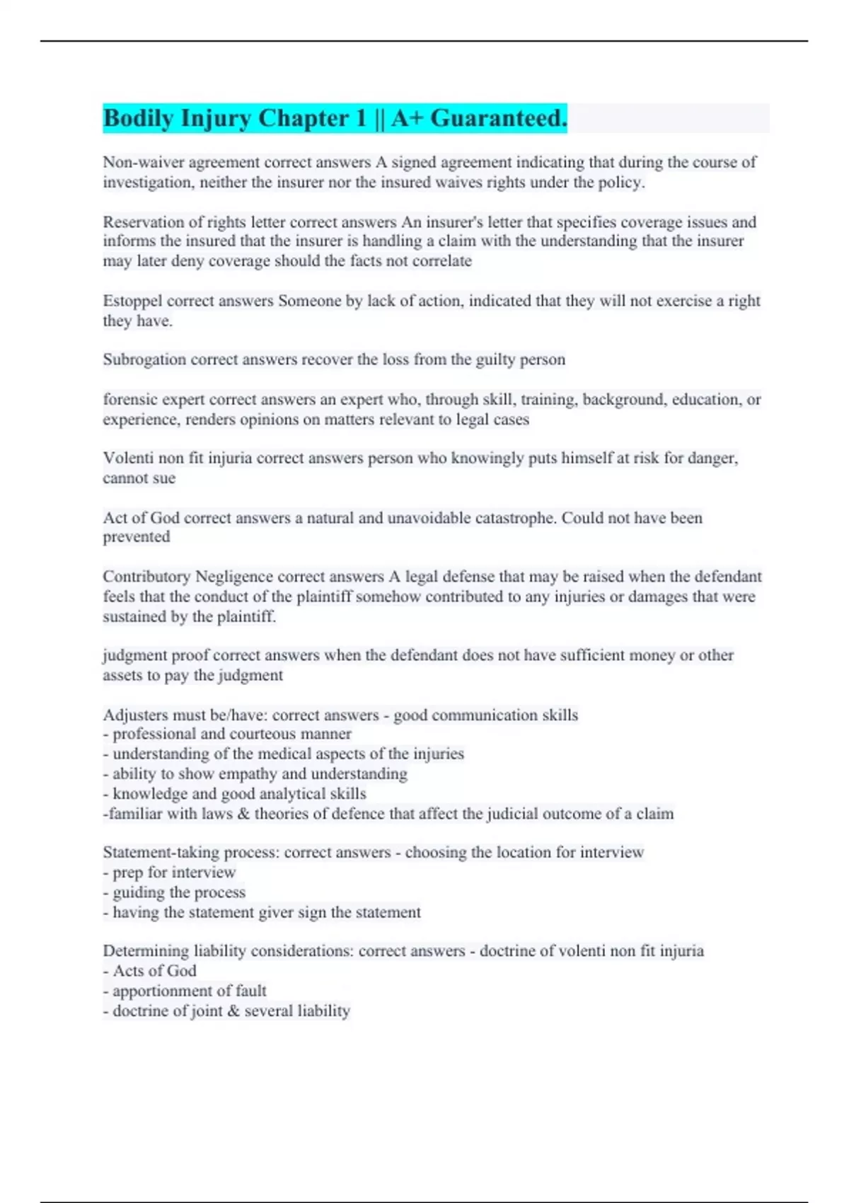 Non-waiver agreement correct answers A signed agreement indicating that during the course of investigation, neither the insurer nor the insured waives rights under the policy. Reservation of rights letter correct answers An insurer's letter that specifies coverage issues and informs the insured that the insurer is handling a claim with the understanding that the insurer may later deny coverage should the facts not correlate Estoppel correct answers Someone by lack of action, indicated that they will not exercise a right they have. Subrogation correct answers recover the loss from the guilty person forensic expert correct answers an expert who, through skill, training, background, education, or experience, renders opinions on matters relevant to legal cases Volenti non fit injuria correct answers person who knowingly puts himself at risk for danger, cannot sue Act of God correct answers a natural and unavoidable catastrophe. Could not have been prevented Contributory Negligence correct answers A legal defense that may be raised when the defendant feels that the conduct of the plaintiff somehow contributed to any injuries or damages that were sustained by the plaintiff. judgment proof correct answers when the defendant does not have sufficient money or other assets to pay the judgment Adjusters must be/have: correct answers - good communication skills - professional and courteous manner - understanding of the medical aspects of the injuries - ability to show empathy and understanding - knowledge and good analytical skills -familiar with laws & theories of defence that affect the judicial outcome of a claim Statement-taking process: correct answers - choosing the location for interview - prep for interview - guiding the process - having the statement giver sign the statement Determining liability considerations: correct answers - doctrine of volenti non fit injuria - Acts of God - apportionment of fault - doctrine of joint & several liability