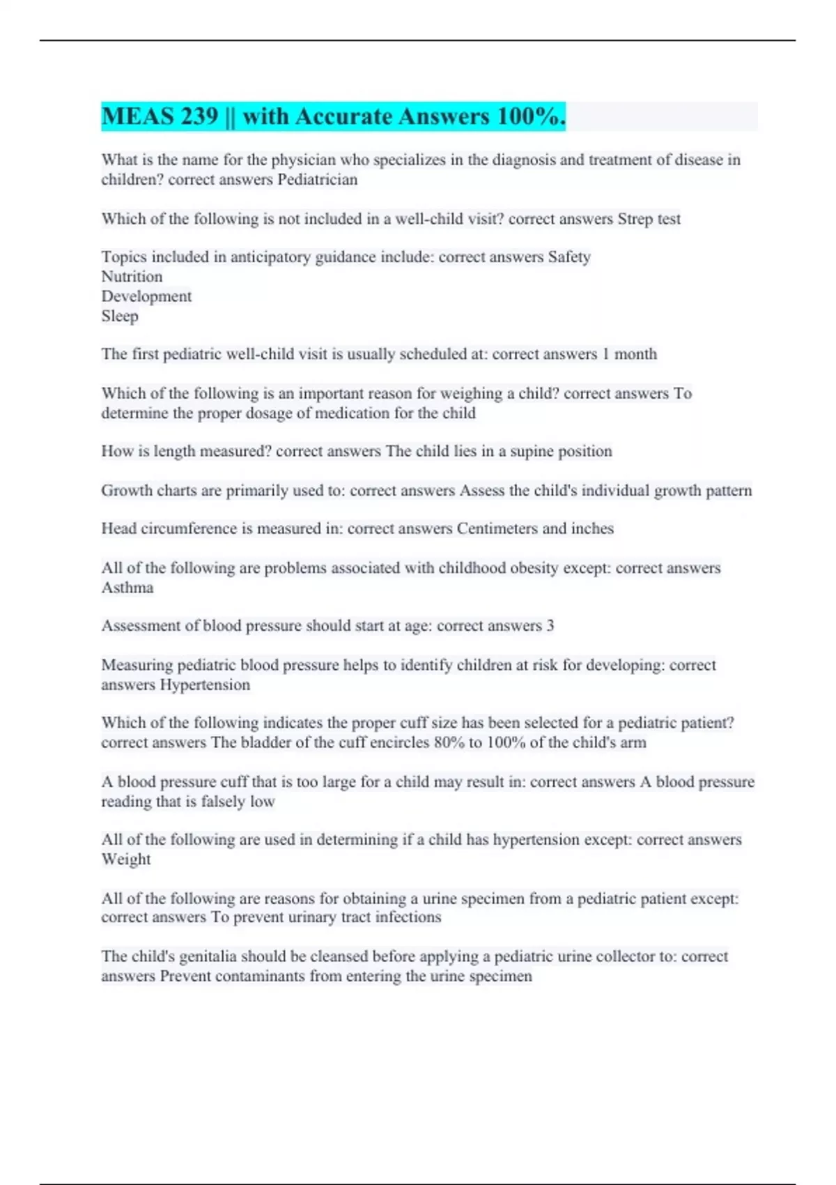 What is the name for the physician who specializes in the diagnosis and treatment of disease in children? correct answers Pediatrician Which of the following is not included in a well-child visit? correct answers Strep test Topics included in anticipatory guidance include: correct answers Safety Nutrition Development Sleep The first pediatric well-child visit is usually scheduled at: correct answers 1 month Which of the following is an important reason for weighing a child? correct answers To determine the proper dosage of medication for the child How is length measured? correct answers The child lies in a supine position Growth charts are primarily used to: correct answers Assess the child's individual growth pattern Head circumference is measured in: correct answers Centimeters and inches All of the following are problems associated with childhood obesity except: correct answers Asthma Assessment of blood pressure should start at age: correct answers 3 Measuring pediatric blood pressure helps to identify children at risk for developing: correct answers Hypertension Which of the following indicates the proper cuff size has been selected for a pediatric patient? correct answers The bladder of the cuff encircles 80% to 100% of the child's arm A blood pressure cuff that is too large for a child may result in: correct answers A blood pressure reading that is falsely low All of the following are used in determining if a child has hypertension except: correct answers Weight All of the following are reasons for obtaining a urine specimen from a pediatric patient except: correct answers To prevent urinary tract infections The child's genitalia should be cleansed before applying a pediatric urine collector to: correct answers Prevent contaminants from entering the urine specimen