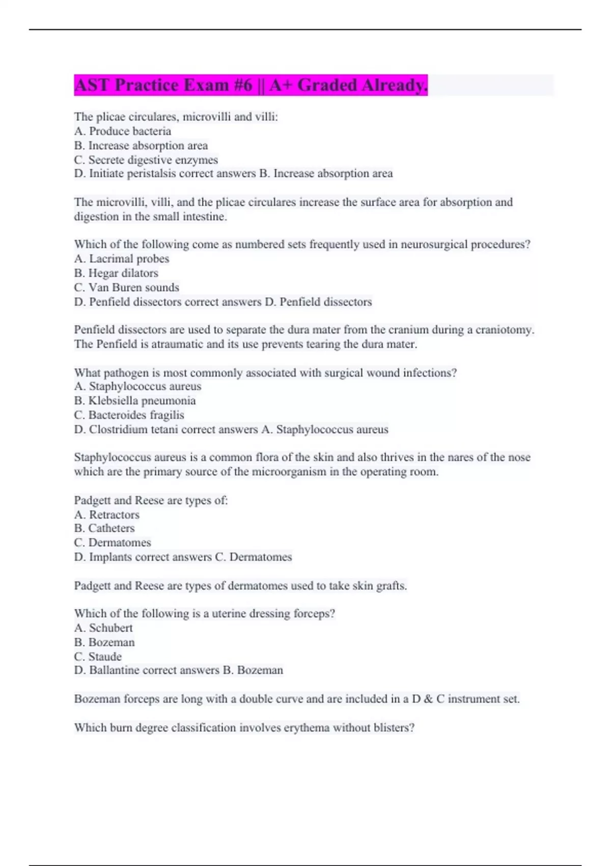 The plicae circulares, microvilli and villi: A. Produce bacteria B. Increase absorption area C. Secrete digestive enzymes D. Initiate peristalsis correct answers B. Increase absorption area The microvilli, villi, and the plicae circulares increase the surface area for absorption and digestion in the small intestine. Which of the following come as numbered sets frequently used in neurosurgical procedures? A. Lacrimal probes B. Hegar dilators C. Van Buren sounds D. Penfield dissectors correct answers D. Penfield dissectors Penfield dissectors are used to separate the dura mater from the cranium during a craniotomy. The Penfield is atraumatic and its use prevents tearing the dura mater. What pathogen is most commonly associated with surgical wound infections? A. Staphylococcus aureus B. Klebsiella pneumonia C. Bacteroides fragilis D. Clostridium tetani correct answers A. Staphylococcus aureus Staphylococcus aureus is a common flora of the skin and also thrives in the nares of the nose which are the primary source of the microorganism in the operating room. Padgett and Reese are types of: A. Retractors B. Catheters C. Dermatomes D. Implants correct answers C. Dermatomes Padgett and Reese are types of dermatomes used to take skin grafts. Which of the following is a uterine dressing forceps? A. Schubert B. Bozeman C. Staude D. Ballantine correct answers B. Bozeman Bozeman forceps are long with a double curve and are included in a D & C instrument set. Which burn degree classification involves erythema without blisters?