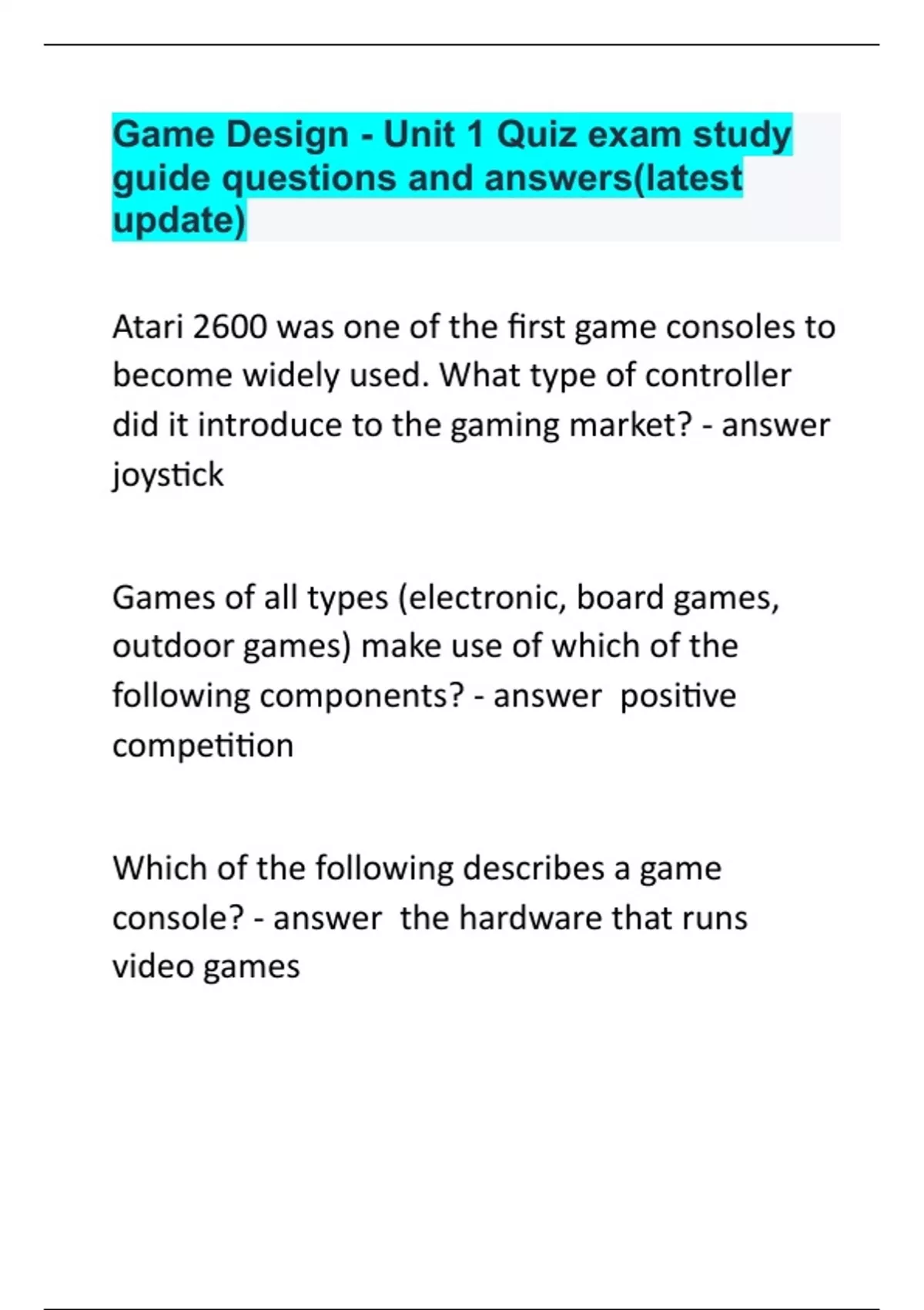 Game Design - Unit 1 Quiz exam study guide questions and answers(latest update)